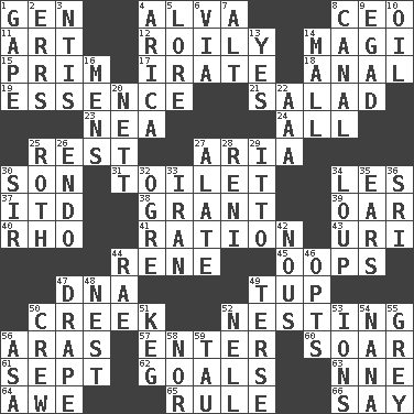 ACROSS 1. Commissioned mil. rank 4. Inventor's middle name 8. Corporate head (abbr.) 11. Tate display 12. Agitated, as a liquid 14. Wise men 15. Demure 17. Feeling or showing extreme anger 18. Of or related to the anus 19. Center 21. First course 23. Teachers' org. 24. 100% 25. State of inaction 27. Roberta Peters solo 30. Boy, to dad 31. Rest room 34. French article 37. It would 38. Let have 39. Boat paddle 40. 17th letter of the Greek alphabet 41. Food allowance for one day 43. RI univ. 44. French philosopher Descartes 45. I made a mistake 47. Heredity factor (abbr.) 49. Uncastrated adult male sheep 50. Small stream 52. Snuggling 56. Ancient river in northeast Turkey 57. Keyboard key 60. Fly high 61. Back-to-school mo. 62. Finish lines 63. Compass dir. 64. Deep reverence 65. General guideline 66. Declare DOWN 1. Stare wonderingly 2. Blunders 3. Nuclear Threat Initiatives 4. N. Chile seaport 5. Old wives' tales, e.g. 6. By way of 7. Keyboard modifier key 8. Lessep's creation 9. Mild oath 10. Petroleum 13. It is so 14. Promenade 16. Not women's 20. Remaining after all deductions 22. Auto club (abbr.) 25. Writer of Portnoy's Complaint (1969) 26. Inside; within (prefix) 27. Having winglike extensions 28. Painter Guido (1575-1642) 29. "Tell ____ the Marines!" 30. Title for a knight 32. Legendary monster 33. SW Asia republic 34. Central Nebraska county 35. Hearing organs 36. Indian title of respect (Mr.) 42. Horse sense 44. Actress Charlotte 46. Elects 47. Window treatment 48. A home for chicks 49. Laconic 50. Ship's personnel 51. Cask 52. 1994 drama film starring Jodie Foster 53. Charged particles 54. Nanny 55. Jennifer or Joel 56. White ___ sheet 58. Or not 59. The 19th letter of the Greek alphabet