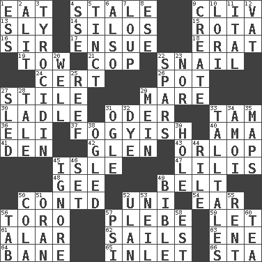 ACROSS 1. Erode 4. Having lost freshness 9. 154 in Roman numerals 13. Mischievous 14. Grain storage towers 15. Roll call or roster of names 16. Title for a knight 17. Follow as a consequence or result 18. Part of Q.E.F. 19. Pull behind 21. Police officer (slang) 22. Slow-paced one 24. An absolute certainty 26. Plant holder 27. Vertical member of a panel or frame 29. Female horse 30. Dipping utensil 31. Baltic tributary 33. Scottish cap 36. Connecticut Ivy Leaguer 37. Out of fashion; old fashioned 40. Wet nurse (var.) 41. Lair 42. Small, secluded valley 43. Lowest deck of a ship 45. Small island 47. Ms. Damita and namesakes 48. Unit of force equal to gravity 49. Waist strap 50. Continued (abbr.) 52. Single; one (prefix) 54. Ewer handle 56. "Corrida" creature 57. Military trainee 59. Allow 61. Having or resembling wings 62. Travel by water 63. Compass dir. 64. Object of repulsion 65. An arm off of a larger body of water 66. R.R. building DOWN 1. Double-curved letter 2. Set down 3. Polypeptide antibiotic 4. Compass dir. 5. A color or tint 6. In addition 7. Central Nebraska county 8. Compass dir. 9. Cause to be 10. Australian parrot (variant) 11. Slanted text style (abbr.) 12. Large container 20. Water source 22. Practice fights 23. And not 25. Coral collection 27. Downhill vehicle 28. Story 29. Chow _ 31. Stare at amorously 32. Color 33. Baron Munchausen's specialties 34. Mine, in Marseilles 35. Atlas contents 38. Stared 39. Opening into or through something 44. Cause heat under the collar 45. Dismiss 46. Arrange properly for use 49. The Good Book 50. Root beer relative 51. Northwest Algerian city 52. Uhlan (variant) 53. Famous astronaut Armstrong 55. Monthly bill 56. Keyboard key 57. Air pressure measure (abbr.) 58. Eastern Standard Time (abbr.) 60. Afternoon social gathering