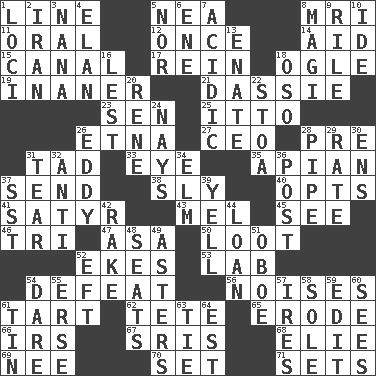 ACROSS 1. Actor's bit 5. Teachers' org. 8. Medical imaging device (abbr.) 11. Of the mouth 12. Single time 14. Help 15. Lessep's creation 17. It's straight from the horse's mouth 18. Stare 19. Sillier 21. Small ungulate mammals of Africa 23. Elected rep. 25. "Tell ____ the Marines!" 26. Inactive volcano in Sicily 27. Corporate head (abbr.) 28. Before (prefix) 31. Small amount or degree 33. Sight organ 35. Bee-related 37. Transmit 38. Cunning 40. Chooses 41. Man with strong sexual desires 43. Cartoonist voice _ Blanc 45. Observe 46. Three (prefix) 47. White ___ sheet 50. Plunder 52. Supplements with great effort 53. Experiment locale 54. Outscore 56. Annoying sounds 61. Small pie 62. Wig 65. Eat (away) 66. Big collection agency 67. Indian titles of respect 68. Writer Wiesel 69. Born 70. Arrange properly for use 71. Puts into a specified state DOWN 1. Locales 2. SW Asia republic 3. Nanny 4. Style 5. And not 6. Compass dir. 7. Being or containing an acid 8. Wise men 9. Cause heat under the collar 10. Binary compound 13. Related on the mother's side 16. For fear that 18. Bear (Spanish) 20. French philosopher Descartes 22. Portico 24. Negative votes 26. Whirlpool 28. Corncob 29. Assign a rank or rating to 30. Followers of ems 31. Lacerate 32. Opposed to 34. Shade tree 36. Mail 37. Fast jet (abbr.) 39. Shout 42. Libertine 44. Grant temporary use of 48. Theater features 49. Michaelmas daisies 51. Mitch Miller's instrument 52. Bank Draft (abbr.) 54. Have the gumption 55. Celtic language 57. Angers 58. Flatfish 59. Prepare for publication 60. Perceives with the eye 61. Metal container 63. Neckwear 64. Eastern Standard Time (abbr.)