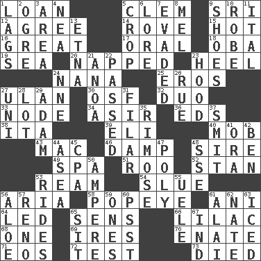 ACROSS 1. Grant temporary use of 5. Clement's nick name 9. _ Lanka 12. Match 14. Be footloose 15. Being at a high temperature 16. Relatively large 17. Spoken 18. Chief or king in Benin or Nigeria 19. Ocean 20. Slept 23. The bottom of a shoe or boot 24. Nanny 25. Greek god of love 27. ____ Bator, Mongolia 30. Order of Saint Francis (abbr.) 32. Superhero pair 33. Connecting point 34. SW Saudi Arabia district 36. Begley and Asner 38. Call ___ day 39. Biblical high priest 40. Disorderly crowd 43. Apple computer (short form) 46. Moist 48. Father 49. Health resort 51. Friend of Pooh 52. Comedian Laurel of Laurel & Hardy 53. 480, 500 or 516 sheets of paper 54. Change direction abruptly 56. Operatic vocal solo 58. Wimpy's pal 61. Cuckoo 64. Directed 65. Elected reps. 66. Pale purple color 68. Single 69. Angers 70. Maternal 71. Greek goddess of the dawn 72. Trial 73. Passed on DOWN 1. Fails to keep up a pace 2. Legendary monster 3. Type of rug 4. Teachers' org. 5. Riding implement 6. Old wives' tales, e.g. 7. Dodged 8. Cartoonist voice _ Blanc 9. Imelda's hoard 10. Loose flowing garment 11. Slanted text style (abbr.) 13. Inactive volcano in Sicily 21. Small Philippine buffalo 22. Went by 23. Parka part 24. Compass dir. 26. Sorrow 27. Corn or form start 28. Car dealer's back yard 29. First man 31. Of or pertaining to a thread or threads 35. Full of chinks, cracks, or crevices 37. Stricken, poetically 41. Mouth or opening 42. Benjamin's nick name 44. At sea 45. Accounting whiz (abbr.) 47. Many (prefix) 48. Compass dir. 50. Electrical Unit 53. Amusement-park features 55. Ubangi River tributary 56. Medicinal plant 57. Western Nevada city 59. Singles 60. Inconspicuous attention getter 61. Jai ____ 62. Nathan's nickname 63. On the rocks 65. Be seated 67. Working for oneself (abbr.)