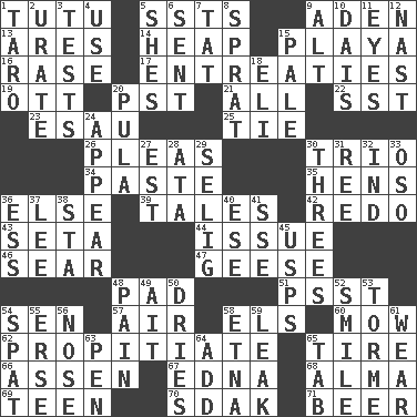 ACROSS 1. Ballerina skirt 5. Fast planes 9. Arabian gulf 13. Ancient Greek god of war 14. Pile 15. Beach, in Buenos Aires 16. Raze (variant) 17. Pleas 19. Baseball player Mel 20. Pacific Standard Time (abbr.) 21. 100% 22. Fast jet (abbr.) 23. He sold his birthright 25. Neckwear 26. Entreaties 30. Musical group of three 34. Thick mixture 35. Coop moms 36. Otherwise 39. Lies 42. Do over again 43. Stalk of a moss capsule 44. Come out of 46. Wither 47. Honkers 48. Groovy apt. 51. Inconspicuous attention getter 54. Elected rep. 57. Atmosphere 58. Raised railways 60. Cut the grass 62. Conciliate 65. Become fatigued 66. NE Netherlands city 67. Pulitzer Prize-winning author Ferber 68. _ mater 69. Adolescent 70. Neighbor of Neb. 71. Fermented drink made from hops DOWN 1. Edible starchy tuberous root 2. A salt of uric acid 3. Trials 4. Purpose 5. "______ My Girl" (Turtles hit) 6. Emitted 7. Make lace 8. Small fatty European fish 9. Keyboard modifier key 10. Raised platform 11. Snake ____ (dice throw) 12. Political cartoonist Thomas 15. Light colored 18. Connecticut Ivy Leaguer 20. Monetary unit of Botswana 24. Seem 27. Eastern Standard Time (abbr.) 28. "One Day ___ Time" 29. Former Milwaukee Brewers owner Bud 30. Triads 31. To separate or throw off 32. Indiana (abbr.) 33. Bear (Spanish) 36. Curvy letter 37. Area sheltered from the wind 38. R.R. building 40. Compass dir. 41. Compass dir. 45. United States Postal Service (abbr.) 48. Ache 49. Small island 50. Frees from moisture 52. Grin 53. Singer Mel 54. Petty quarrel 55. Celtic language 56. Olfactory organ 58. Inactive volcano in Sicily 59. Path through which fluid escapes 61. Erode 63. Fenced enclosure 64. Say or write further 65. Keyboard key