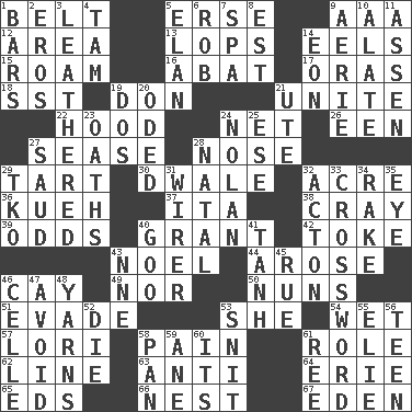 ACROSS 1. Waist strap 5. Celtic language 9. Auto club (abbr.) 12. Type of rug 13. Chops off 14. Snakelike fish 15. Wander aimlessly 16. Blind as ____ 17. Mouths or openings 18. Fast jet (abbr.) 19. Spanish title 21. Join together 22. Parka part 24. Fish or hair follower 26. Car or cant ending 27. Gospel singer Marvin 28. Olfactory organ 29. Small pie 30. A sleeping potion; an opiate (poet.) 32. 43,560 square feet 36. Malaysian steamed pastry 37. Call ___ day 38. Supercomputer manufacturer 39. Probability 40. Monetary aid 42. Puff or smoke 43. Christmas carol 44. Came up 46. Island 49. Not either 50. Religious women 51. Dodge 53. A female animal or person 54. Soggy 57. Australian parrot (variant) 58. Ache 61. Hero or heavy, e.g. 62. Actor's bit 63. Opposed to 64. 4th largest of the Great Lakes 65. Begley and Asner 66. Egg locale 67. Locale of original sin DOWN 1. Soap units 2. Greek god of love 3. Tough but pliablecoriaceous 4. Scottish cap 5. Liveliness 6. Director Reiner 7. Health resort 8. Eastern Standard Time (abbr.) 9. Nest on high 10. Having winglike extensions 11. NE Netherlands city 14. A really long time 19. Two (Sp.) 20. Wrote a lyric poem 21. Shoshoni 23. Profane or obscene expressions 24. Pitcher Ryan 25. Compass dir. 27. Saudi Arabian king (1953-1964) 28. Relating to or accompanying birth 29. Ring climax 31. One who wires 32. NE Massachussets city 33. What you're doing now 34. Immoral or dissolute person 35. Sight organ 40. Thick or sticky substance 41. Hyperbolic tangent 43. Compass dir. 45. Regret 46. Cell (Danish) 47. Stay clear from 48. Entertaining tales 52. Pass on 53. In a ____ (agitated or irritated) 55. Writer Wiesel 56. Adolescent 58. Baking dish 59. A saturated hydrocarbon 60. ___ a Wonderful Life 61. To separate or throw off