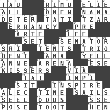 ACROSS 1. The 19th letter of the Greek alphabet 4. Tall New Zealand timber tree 8. Writer Wiesel 12. Everything 13. Presage 14. Nanny 15. Prevent from occurring 18. Jacques of French films 19. Russian ruler 20. Tendancy to err 22. Before (prefix) 23. Johnson of "Laugh-In" 24. Area sheltered from the wind 25. Arrange properly for use 26. Legislator 30. Indian title of respect (Mr.) 33. Portable shelters 36. Musical group of three 37. Gouge 39. Santa ___, CA 40. Shout 41. Queen of England 1702-14 42. Sports stadium 44. Compass dir. 45. Smoochers 47. By way of 50. Make lace 51. Body of Kaffir warriors 53. Be seated 54. Heighten or intensify 57. Actor Baldwin 59. Prong on a fork 61. Moves on water 63. Stitch closed the eyes of (a falcon) 64. Likelihood 65. Compass dir. 66. Introduce or present, as a question 67. A blast of a horn 68. Layer DOWN 1. Bit 2. Toward shelter 3. Extremist 4. College mil. group 5. "If ____ say so..." 6. Was introduced to 7. Corn or form start 8. Plea 9. Goldbrick 10. _ tizzy (2 wds.) 11. Ewer handle 16. Blunders 17. Assign a rank or rating to 21. Remaining after all deductions 22. Fenced enclosure 24. French article 26. Comedian Laurel of Laurel & Hardy 27. Family _ (genealogy) 28. Petroleums 29. Hero or heavy, e.g. 30. Neighbor of Neb. 31. Painter Guido (1575-1642) 32. Restaurants 34. Hearing organs 35. Compass dir. 38. A testis 42. Tate display 43. Opinion 46. Consume 48. Naughty children 49. Capital of Western Samoa 52. From or relating to Ireland 53. Observes 54. _ china 55. Egg locale 56. Otherwise 57. Viper 58. Lion 59. Small child 60. Wedding promise 62. Elected rep.