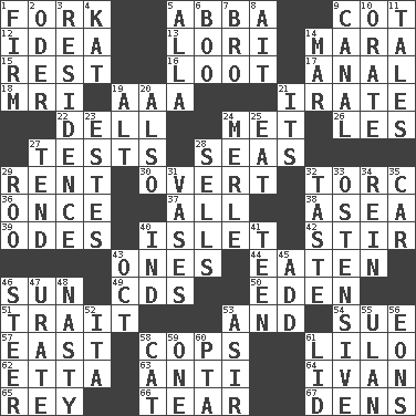 ACROSS 1. Tined utensil 5. Swedish rock group 9. Small bed 12. It may be bright or harebrained 13. Australian parrot (variant) 14. Hindu Mythology: god of death 15. Repose 16. Spoils 17. Of or related to the anus 18. Medical imaging device (abbr.) 19. Auto club (abbr.) 21. Feeling or showing extreme anger 22. Small valley 24. Was introduced to 26. French article 27. Trials 28. Oceans 29. Monthly bill 30. Unconcealed 32. Torque (variant) 36. Single time 37. Everything 38. At sea 39. Lyric poems 40. Small island 42. Disorderly outburst 43. Washington bills 44. Consumed 46. Player for Phoenix 49. Music discs 50. Locale of original sin 51. Distinguishing feature 53. Plus 54. Take to court 57. 90 degrees 58. 911 reaches them 61. _ and Stitch 62. Singer James 63. Opposed to 64. _ the terrible 65. Marina Del _, California 66. Separate forcefully 67. Habitations of wild animals DOWN 1. Securely fixed in place 2. Baltic tributary 3. Home 4. Krazy ___ of comics 5. Silent film actress Nazimova 6. Sometimes accompanies a hiss 7. Sis' sibling 8. Small island 9. Lessep's creation 10. Declaim 11. Stories 14. Impair 19. The first octave above the treble staff 20. In addition 21. ___ a Wonderful Life 23. _____ Park, CO 24. Haggard of country music 25. Consume 27. Look after 28. Makes a sale 29. Friend of Pooh 31. Flower holders 32. Clothes sense 33. Clearly or manifestly demonstrative 34. It's straight from the horse's mouth 35. Automobile 40. Indiana (abbr.) 41. Adolescent 43. Sep. follower 45. Increase 46. Bull 47. A salt of uric acid 48. Difficult 52. Call ___ day 53. SW Saudi Arabia district 55. Uhlan (variant) 56. Immeasurably long periods of time 58. Domesticated feline 59. Single 60. Parent Teacher Assoc. 61. Flaplike covering