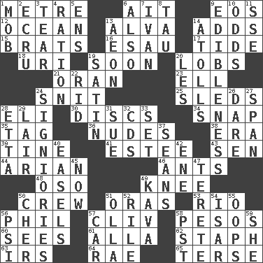 ACROSS 1. Distance measurement (Brit.) 6. Small island 9. Greek goddess of the dawn 12. Sea 13. Inventor's middle name 14. Does sums 15. Naughty children 16. Son of Isaac 17. Periodic rise and fall of the sea level 18. RI univ. 19. Within a short period 20. Tennis shots 21. Northwest Algerian city 23. Pipe bend 24. In a ____ (agitated or irritated) 25. Bobsleighs 28. Biblical high priest 30. Flat circles 34. Fastener 35. Label 36. Unclothed pictures 38. Epoch 39. Prong on a fork 41. First name in cosmetics 43. Elected rep. 44. Believer in; advocate of (suffix) 46. Pismires 48. Bear (Spanish) 49. Leg joint 50. Group working together 51. Mouths or openings 53. _ de Janeiro 56. Silvers or Donahue 57. 154 in Roman numerals 58. Mexican monetary units 60. Perceives with the eye 61. Silent film actress Nazimova 62. Staphylococcus 63. Big collection agency 64. Actress Charlotte 65. Laconic DOWN 1. Disorderly crowd 2. Shade of tan 3. Pull apart 4. Food allowance for one day 5. Followers of ems 6. In addition 7. _ the terrible 8. The 19th letter of the Greek alphabet 9. The property of being fit to eat 10. Likelihood 11. Compass dir. 13. A really long time 14. Ringlike coral islands and reefs 19. Smooth fabric 20. French article 22. To free from 24. Seigniories (variant) 26. Have the gumption 27. Connect, as a bridge 28. Singer James 29. Den 31. Institute legal proceedings 32. Music discs 33. Put into a specified state 37. Seines 40. Artist's stands 42. Compass dir. 45. Immediately 47. Cigar-shaped 49. Polynesian shrub of the pepper family 50. "Mermaids" star 51. Rounded earthenware pot or jar 52. Cause heat under the collar 54. Austrian river, tributary to the Danube 55. I made a mistake 56. Air pressure measure (abbr.) 57. 4-wheeled motor vehicle 58. Pacific Standard Time (abbr.) 59. A female animal or person