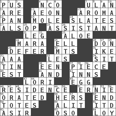 ACROSS 1. Festering 4. Non-commissioned officer (abbr.) 7. Uhlan (variant) 11. "We ___ not amused" (Victoria) 12. A really long time 13. Scent 14. Baking dish 15. Undercover agent 16. Chalkboards 17. Columnist Joseph or Stewart 19. Helper 21. Part of a journey 23. Medicinal plant 24. Hindu Mythology: god of death 25. Pipe bend 26. Spanish title 29. Put off 30. Mountains (abbr.) 31. Eisenhower's nickname 32. American Automobile Association (abbr.) 33. French article 34. Be seated 35. Shallow baking pan 36. Car or cant ending 37. Component 40. Eastern Standard Time (abbr.) 41. Also 42. Lodging establishments 43. Australian parrot (variant) 45. Ovum 46. Dwelling 51. Bert's buddy 55. Declaimed 56. Possessive pronoun 58. Conclude 59. Lugs 60. Set down 61. It would 62. SW Saudi Arabia district 63. Bear (Spanish) 64. Myrna of the movies DOWN 1. Dad 2. Mountain range 3. Elected reps. 4. Modern: prefix 5. Root beer relative 6. Singles 7. A salt of uric acid 8. Globular water bottle used in Asia 9. So be it 10. Political cartoonist Thomas 12. Electrical Unit 13. In addition 16. Beverly of Met fame 18. Norwegian king 20. Table seasonings 22. Slender fish 24. Intended 25. Make improvements or corrections to 26. Flat circles 27. Migrant worker of the '30s 28. Fish or hair follower 29. Raised platform 32. Had dinner 33. Soviet premier 1918-24 36. Having ears or earlike features 37. Sliced dessert 38. Eat 39. Engineer (abbr.) 43. 61 cubic inches 44. Lyric poems 46. Roll call or roster of names 47. Greek god of love 48. Suttee (variant) 49. US Secretary of Labor Elaine L. _ 50. Snakelike fish 52. Famous astronaut Armstrong 53. To the inside or interior of 54. Whirlpool 57. _ de Janeiro