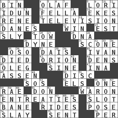 ACROSS 1. Storage container 4. Norwegian king 8. Australian parrot (variant) 12. Goddess of spring and wife of Bragi 14. Man or boy (slang) 16. Supplements with great effort 17. French philosopher Descartes 18. Household entertainment appliance 20. Natives or inhabitants of Denmark 22. Victory 23. Eastern Standard Time (abbr.) 24. Roguish 25. Pull behind 28. Heredity factor (abbr.) 30. Centimeter-gram-second unit of force 31. Biscuitlike quick bread 35. Bear (Spanish) 37. Raised platform 40. _ the terrible 41. Passed on 42. Greek mythologigal hunter 44. Habitations of wild animals 45. Cassini of fashion 46. Trig term 47. _ tizzy (2 wds.) 48. NE Netherlands city 50. Flat circle 52. Mayday 54. Raised railways 55. Single 58. Actress Charlotte 61. Spanish title 63. Make _____ (do battle with) 65. Pleas 70. Narrow opening 71. Object of repulsion 72. Amusement-park features 73. Airs 74. Kill 75. Posted 76. For each DOWN 1. Avian creatures 2. Standard of perfection 3. Pet term 4. Often (poetically) 5. Area sheltered from the wind 6. 100% 7. Soared 8. French article 9. Migrant worker of the '30s 10. Vintage cars 11. Is not 13. Born 15. Enthusiastic 19. Taverns 21. Filthy place 26. Southwest Nigerian state 27. Puts on (as clothing) 29. Being or containing an acid 30. Evades 32. Baking chamber 33. Nanny 34. Followers of ems 35. Petroleums 36. Perceives with the eye 38. One more than two 39. Something which is sent 41. ___ good deed 43. Famous astronaut Armstrong 49. Connecting point 51. Compass dir. 53. Fly high 55. Lowest deck of a ship 56. Trap for birds or small mammals 57. Keyboard key 58. Confederate soldiers (slang) 59. Of or related to the anus 60. Inactive volcano in Sicily 62. Nuclear Threat Initiatives 64. Cleo's killer 66. Marina Del _, California 67. Binary compound 68. Car or cant ending 69. Fast jet (abbr.)