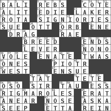 ACROSS 1. Indonesian resort city 5. Confederate soldiers (slang) 9. ____ d'Azur (French Riviera) 13. Set down 14. Singer Brickell 15. Member of a famous L.A. basketball team 16. Round or rotation of duties 17. Seigniories (variant) 19. Take to court 20. Baseball player Mel 21. Globe 22. Compass dir. 23. To trail on the ground 25. Actress Charlotte 26. A special lineage 30. Extremities 34. Prying instrument 35. Words to Nanette 36. Grand slam 39. Maternal 42. It was, poetically 43. Washington bills 44. Peter (Polish) 46. 270 degrees 47. Follow as a consequence or result 48. Make lace 51. Wig 54. Bear (Spanish) 57. Title for a knight 58. The 19th letter of the Greek alphabet 60. Curvy letter 62. Frustrating wastes of time 65. Part of Q.E.F. 66. Approach 67. Olfactory organ 68. "____ silly question..." 69. Ooze 70. Singer James 71. It's straight from the horse's mouth DOWN 1. Long, evenly shaped pieces 2. Verbally 3. 61 cubic inches 4. Call ___ day 5. Take ten 6. Prepare for publication 7. Large 8. Sir (Sp.) 9. 4-wheeled motor vehicle 10. Migrant worker of the '30s 11. Adolescent 12. Celtic language 15. Ear part 18. Lyricist Gershwin 20. Legendary monster 24. Most capable 27. Night before a holiday 28. Car or cant ending 29. Window treatment 30. Main course 31. Immediately 32. Heredity factor (abbr.) 33. Mayday 36. Promise 37. Single 38. French article 40. Shallow baking pan 41. Greek goddess of the dawn 45. Ballerina skirt 48. Russian ruler of old 49. Wind 50. Heavy duty weighing machine 52. Laconic 53. 1973 Nobel Price Winner (Physics) Leo 54. Mouths or openings 55. Trig term 56. Double curve, resembling the letter S 58. Trial 59. Toward the sea 61. Comedian Laurel of Laurel & Hardy 63. Atlas unit 64. Car dealer's back yard 65. Hearing organ