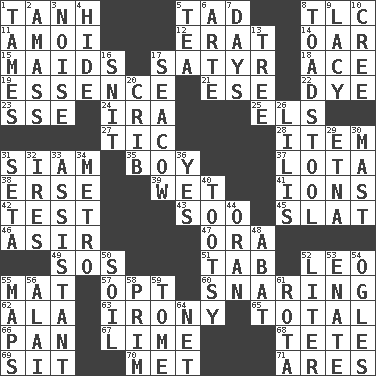 ACROSS 1. Hyperbolic tangent 5. Small boy 8. Affectionate concern, for short 11. Mine, in Marseilles 12. Part of Q.E.F. 14. Rowing implement 15. Unmarried girls 17. Letch 18. Adept person 19. Substance 21. Compass dir. 22. Color 23. Compass dir. 24. Lyricist Gershwin 25. Raised railways 27. Nervous spasm 28. A whole individual unit 31. Thailand, formerly 35. Male child 37. Globular water bottle used in Asia 38. Celtic language 39. Dripping 41. Charged atoms 42. Trial 43. "Barney Miller" actor Jack 45. Narrow board 46. SW Saudi Arabia district 47. Mouth or opening 49. Distress signal 51. Bar bill 52. Lion 55. Floor covering 57. Elect 60. Catching in a trap 62. Chicken ___ king 63. Literary sarcasm 65. "_____ Recall" 66. Baking dish 67. Welles in "The Third Man" 68. Wig 69. Be seated 70. Was introduced to 71. Ancient Greek god of war DOWN 1. Corrects by punishment or discipline 2. Collect or gather 3. Annoying sound 4. Flintstone garb 5. Afternoon social gathering 6. Johnson of "Laugh-In" 7. 24-hour periods 8. Inedible or poisonous agaric 9. Made of lace 10. Algonquian 13. Woody plant 16. In a ____ (agitated or irritated) 17. Manatee 20. Baby bed with high sides 26. Ms. Damita and namesakes 29. Inactive volcano in Sicily 30. Vertical spar for supporting sails 31. Bristle 32. Angers 33. Aide 34. Paris' subway 36. It is so 40. Tootsie (variant) 44. NW Algerian seaport 48. Blind as ____ 50. The visible part of the earth's surface 52. 61 cubic inches 53. Related on the mother's side 54. Stares at amorously 55. Atlas contents 56. Jai _ 58. Demure 59. Heavy book 61. Roll call or roster of names 64. Fish or hair follower
