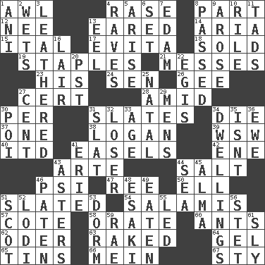 ACROSS 1. Leather borer 4. Raze (variant) 8. Piece 12. Born 13. Having ears or earlike features 14. Roberta Peters solo 15. Slanted text style (abbr.) 17. Webber/Rice musical 18. Exchanged or delivered for money 19. Paper fasteners 21. Makes clutter 23. Part of HMS, perhaps 24. Elected rep. 26. Unit of force equal to gravity 27. Certainty 28. Among 30. For each 31. Chalkboards 34. Expire 37. Single 38. Utah city north of Ogden 39. Compass dir. 40. It would 41. Artist's stands 42. Compass dir. 43. Johnson of "Laugh-In" 44. Table seasoning 46. 23rd letter of the Greek alphabet 47. Portuguese money of account (variant) 50. Pipe bend 51. Scheduled 54. Deli grouping 57. ____ d'Azur (French Riviera) 58. Declaim 60. Pismires 62. Baltic tributary 63. Swept the length of 64. Set 65. Airtight sealed metal containers 66. Count _ (2 wds.) 67. Filthy place DOWN 1. Black tropical American cuckoo 2. Moistens 3. Resembling or made to resemble leather 4. All-night dance parties 5. Ascend 6. Arrange properly for use 7. Dutch treat 8. Went by 9. Came up 10. Cause heat under the collar 11. Small amounts or degrees 13. Snakelike fish 16. Den 20. Pacific Standard Time (abbr.) 22. The front part of a cuirass 25. Relating to or accompanying birth 27. Penny 29. Not women's 30. Luau course 31. Narrow board 32. Failure 33. Grow older 34. Residences 35. Is not 36. She-sheep 41. 4th largest of the Great Lakes 43. Michaelmas daisies 44. Ocean 45. _ mater 46. Eucharist need 48. 1973 Nobel Price Winner (Physics) Leo 49. Ingested 51. Highlander 52. Farming town in central California 53. Dormintory (informal) 55. Directed 56. Proofreading order 59. Actress Charlotte 61. Stealthy