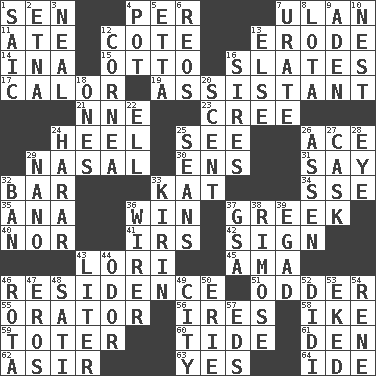ACROSS 1. Elected rep. 4. For each 7. ____ Bator, Mongolia 11. Had dinner 12. ____ d'Azur (French Riviera) 13. Wear away 14. _ tizzy (2 wds.) 15. Von Bismarck 16. Chalkboards 17. Bodily heat indicating an inflammation 19. Aide 21. Compass dir. 23. Algonquian 24. Person who is morally reprehensible 25. Observe 26. Adept person 29. Rhinal 30. Followers of ems 31. Declare 32. Long, evenly shaped piece 33. Krazy ___ of comics 34. Compass dir. 35. Santa ___, CA 36. Acquire through effort 37. Of Greece 40. And not 41. Big collection agency 42. Public display of a written message 43. Australian parrot (variant) 45. Nursemaid (var.) 46. Home 51. More peculiar 55. Speaker 56. Angers 58. Mamie's mate 59. Carrier 60. Periodic rise and fall of the sea level 61. Lair 62. SW Saudi Arabia district 63. Consenting reply 64. Binary compound DOWN 1. Ketch in the Levant 2. Inactive volcano in Sicily 3. Be tempered by heat 4. Cooking vessel 5. Singer James 6. Vintage cars 7. A salt of uric acid 8. Globular water bottle used in Asia 9. Arabian gulf 10. Egg locale 12. Pupil covering 13. Otherwise 16. Begets 18. Singles 20. Odor 22. Pipe bend 24. Ethiopian city, capital of Harari 25. Actors Connery and Penn 26. NE Netherlands city 27. Keg 28. Sight organ 29. Billionth: prefix 32. Prohibit 33. Japanese brewing company 36. One who wires 37. Girls' org. (abbr.) 38. Full of chinks, cracks, or crevices 39. Mild oath 43. 61 cubic inches 44. Scent 46. Roll call or roster of names 47. Greek god of love 48. Suttee (variant) 49. Municipality 50. 4th largest of the Great Lakes 52. "You Light Up My Life" star Conn 53. Supplemented with great effort 54. French philosopher Descartes 57. Begley and Asner
