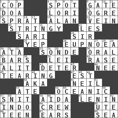 ACROSS 1. Police officer (slang) 4. Blemish 8. Yard entry 12. ___ good deed 13. Australian parrot (variant) 14. Legendary monster 15. Small fatty European fish 18. ____ Jay Lerner 19. Distinctive style or manner 20. Slender, wiry 22. French article 23. Indian skirt 24. Title for a knight 25. Slangy assent 26. Normal relaxed breathing 30. _ moment's notice (2 wds.) 33. Something which is sent 36. Taken by mouth 37. Long, evenly shaped pieces 39. Luau accessory 40. To erase 41. Came down and settled, as after flight 42. Prevent from occurring 44. Born 45. Pulling apart 47. Eastern Standard Time (abbr.) 50. Alias (abbr.) 51. Famous astronaut Armstrong 53. Had dinner 54. Pertaining to the sea 57. In a ____ (agitated or irritated) 59. Opera by Verdi 61. Soviet premier 1918-24 63. Southeast Asian peninsula 64. Ship's personnel 65. Shoshoni 66. Adolescent 67. Hearing organs 68. Ocean DOWN 1. Music discs 2. I made a mistake 3. Actors' quests 4. Volcanic refuse 5. Much (prefix) 6. Mouth or opening 7. Shallow baking pan 8. Head of state? 9. Matures 10. Three (prefix) 11. Car or cant ending 16. Like ___ of sunshine 17. Become fatigued 21. Cuts off 22. Mouth edge 24. Institute legal proceedings 26. Singer Brickell 27. Northwest Algerian city 28. Relaxation 29. Toward shelter 30. Blind as ____ 31. Falsehood 32. Operatic vocal solo 34. Cassini of fashion 35. Fish or hair follower 38. Ski resort town in Vermont 42. Heredity factor (abbr.) 43. French philosopher Descartes 46. Eisenhower's nickname 48. Lick closed 49. Prong on a fork 52. "_ and Lucy" (Charlie Brown theme song) 53. Assistant 54. River in Europe 55. Crow sounds 56. Quote 57. Be seated 58. Compass dir. 59. Adept person 60. Lyricist Gershwin 62. Teachers' org.