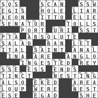 ACROSS 1. Mayday 4. Examine minutely or intensely 8. Compass dir. 11. Armor plate that protects the chest 13. Opening into or through something 14. One who doesn't tell the truth 15. A really long time 16. "Tell ____ the Marines!" 17. Writer Wiesel 18. Legislator 21. For Whom the Bell _____ 22. Sweet dark-red dessert wine 23. RI univ. 25. Fast jet (abbr.) 26. Parent Teacher Assoc. 29. Utter; complete 32. First course 34. Prohibit 35. Allow 38. Slanted text style (abbr.) 39. Inhabitant of Heaven 41. Of or related to the anus 43. _ tizzy (2 wds.) 44. "We ___ not amused" (Victoria) 45. White American of non-Hispanic descent 46. Consumed 50. Marina Del _, California 51. Compass dir. 54. Double-curved letter 55. Extremities 57. Colored lightly or faintly 59. Inhabiting a nest 63. In addition 64. Supplemented with great effort 67. Length times width 68. Central Nebraska county 69. Past tense of be (plural) 70. A home for chicks 71. Compass dir. 72. Mild oath 73. A female animal or person DOWN 1. Oceans 2. Double curve, resembling the letter S 3. The Jewish people; Israel 4. Upper-body garments 5. Small bed 6. The first octave above the treble staff 7. Modern: prefix 8. Beverly of Met fame 9. Moves on water 10. Obtain by seizing forcibly or violently 12. Fastener 14. Lion 19. Frog relative 20. Globe 21. Teat (slang) 23. ____ Bator 24. Undersized animal 26. 23rd letter of the Greek alphabet 27. Jacques of French films 28. ____ Jay Lerner 30. Off-Broadway awards 31. Style 33. Jai ____ 36. Engineer (abbr.) 37. Lie 39. Settles 40. Ancient Greek god of war 42. Myrna of the movies 45. Does sums 47. Fish or hair follower 48. Looked after 49. Compass dir. 51. Showing deterioration from age 52. Grain storage towers 53. Follow as a consequence or result 56. Comedian Laurel of Laurel & Hardy 58. Police officer (slang) 60. Angers 61. Delicate 62. Yard entry 64. She-sheep 65. Cask 66. Period