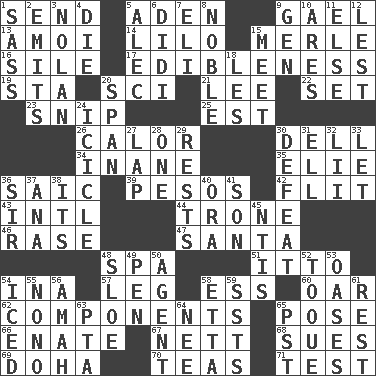 ACROSS 1. Transmit 5. Arabian gulf 9. Highlander 13. Mine, in Marseilles 14. _ and Stitch 15. Haggard of country music 16. Filth; sediment 17. The property of being fit to eat 19. R.R. building 20. _-fi 21. Area sheltered from the wind 22. Put into a specified state 23. Sever or remove by pinching or nipping 25. Eastern Standard Time (abbr.) 26. Bodily heat indicating an inflammation 30. Small valley 34. Lacking in sense or substance 35. Writer Wiesel 36. Ketch in the Levant 39. Mexican monetary units 42. Secret move to avoid paying debts 43. International (abbr.) 44. Heavy duty weighing machine 46. Raze (variant) 47. Before Barbara or Clara 48. Health resort 51. "Tell ____ the Marines!" 54. _ tizzy (2 wds.) 57. Part of a journey 58. Double-curved letter 60. Rowing implement 62. Parts 65. Airs 66. Maternal 67. Remaining after all deductions 68. Institutes legal proceedings 69. Capital of the state of Qatar 70. Beverages made from leaves 71. Trial DOWN 1. Backtalk 2. Sends forth 3. Pitcher Ryan 4. Expire 5. Actor Baldwin 6. "You Light Up My Life" star Conn 7. Connecticut Ivy Leaguer 8. Impressive in appearance 9. Commissioned military rank (abbr.) 10. Ancient Greek god of war 11. Otherwise 12. For fear that 15. Rendezvous 18. French article 20. Connect, as a bridge 24. Hanging ice 27. Infant locale 28. Single 29. Musical pauses 30. Outscore 31. Pipe bend 32. Cards in a Roman deck? 33. Allow 36. Title for a knight 37. Santa ___, CA 38. ___ a Wonderful Life 40. Mouth or opening 41. Manchild 45. Nuclear Threat Initiatives 48. A type of plum 49. Animal enclosure 50. Representative 52. Woman's close-fitting hat 53. Fertile tracts in a desert 54. On the rocks 55. Words to Nanette 56. Wet nurse 58. Singer James 59. Fast planes 61. Respite 63. Parent Teacher Association (abbr.) 64. Born 65. Pacific Standard Time (abbr.)