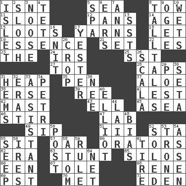 ACROSS 1. Is not 5. Ocean 8. Pull behind 11. _ gin 12. Baking dishes 14. Mature 15. Plunders 17. Entertaining tales 18. Allow 19. Gist 21. Put into a specified state 22. French article 23. Definite Article 24. Big collection agency 25. Fast jet (abbr.) 27. Small child 28. Smile enhancers 31. Pile 35. Writing instrument 37. _ vera 38. Celtic language 39. To separate or throw off 41. For fear that 42. Vertical spar for supporting sails 43. Pipe bend 45. At sea 46. Move through with a circular motion 47. Experiment locale 49. Small drink 51. One more than two 52. R.R. building 55. Be seated 57. Boat paddle 60. Speakers 62. Period 63. Difficult or unusual or dangerous feat 65. Grain storage towers 66. Car or cant ending 67. Lacquered or enameled metalware 68. French philosopher Descartes 69. Pacific Standard Time (abbr.) 70. Was introduced to 71. Paradise DOWN 1. Small island 2. Make a splashing sound 3. Trap for birds or small mammals 4. False hair 5. Health resort 6. Hearing organs 7. Queen of England 1702-14 8. Baron Munchausen's specialties 9. Double curve, resembling the letter S 10. Soaks 13. Fast planes 16. In a ____ (agitated or irritated) 17. Last past 20. Riding implement 26. Any of the three canals of the cochlea 29. Introduce or present, as a question 30. Bristle 31. Cloth borders 32. Part of Q.E.F. 33. Aide 34. _ dish (used to culture cells) 36. Born 40. American author Paul (1891-1958) 44. Den 48. Prejudice 50. Mail 52. Having a sole or soles 53. Heavy duty weighing machine 54. NE Netherlands city 55. Ooze 56. Angers 58. Smallest unit of an element 59. Court order 61. Become fatigued 64. Fish or hair follower