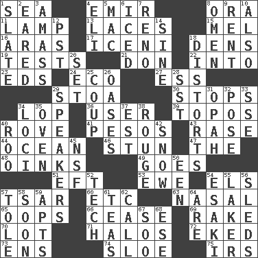 ACROSS 1. Ocean 4. Arab leader 8. Mouth or opening 11. Desk light 13. Shoestrings 15. Cartoonist voice _ Blanc 16. Ancient river in northeast Turkey 17. Ancient Celtic tribe of eastern Britain 18. Habitations of wild animals 19. Trials 21. Spanish title 22. To the inside or interior of 23. Begley and Asner 24. Environmental prefix 27. Double-curved letter 29. Portico 30. Closes up, plugs up 34. Trim (branches) 36. One who uses or employs something 39. Literary convention 40. Be footloose 41. Mexican monetary units 43. To erase 44. Sea 46. Surprise greatly 47. Definite Article 48. Pig sounds 49. Moves 51. Lizard (obsolete) 53. She-sheep 54. Raised railways 57. Russian ruler of old 60. And so on (abbr.) 63. Rhinal 65. I made a mistake 66. Stop 69. Immoral or dissolute person 70. Car dealer's back yard 71. Saint headwear 72. Made supply last 73. Followers of ems 74. _ gin 75. Big collection agency DOWN 1. Schedule 2. Having ears or earlike features 3. Collect or gather 4. Connecticut Ivy Leaguer 5. Big _ 6. On the rocks 7. Former U.S. Attorney General Janet 8. Sign of things to come 9. Monthly bill 10. In addition 12. Pacific Standard Time (abbr.) 14. Trig term 18. What propaganda does 20. Put into a specified state 25. Overturn; upset 26. Fertile tracts in a desert 28. Fast jet (abbr.) 29. Orators 31. Brightly colored fish 32. Airs 33. Compass dir. 34. Venues 35. Baking chamber 37. Eastern Standard Time (abbr.) 38. Makeup applied to the cheeks 40. Friend of Pooh 42. Frozen precipitation 45. Overdraft (abbr.) 50. Car or cant ending 52. Technical 54. 1973 Nobel Price Winner (Physics) Leo 55. Member of a famous L.A. basketball team 56. Bobsleighs 57. Lacquered or enameled metalware 58. Within a short period 59. Tenement units (abbr.) 61. Beverages made from leaves 62. Give a ring to 64. "We ___ not amused" (Victoria) 67. "Barney Miller" actor Jack 68. Compass dir.