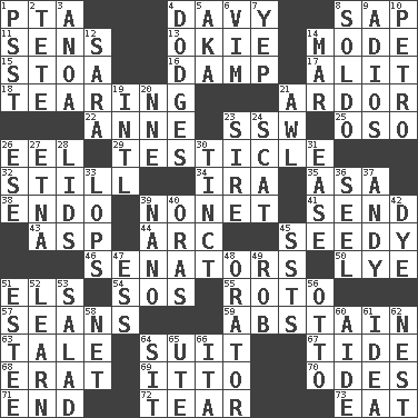 ACROSS 1. Parent Teacher Assoc. 4. American folk hero Crockett 8. Plant excrement 11. Elected reps. 13. Migrant worker of the '30s 14. Method 15. Portico 16. Moist 17. Came down and settled, as after flight 18. Separating forcefully 21. Zeal 22. Queen of England 1702-14 23. Compass dir. 25. Bear (Spanish) 26. Snakelike fish 29. A testis 32. Not moving 34. Retirement account (abbr.) 35. White ___ sheet 38. Inside; within (prefix) 39. Music written for nine 41. Post 43. Viper 44. Curve 45. Shabby and untidy 46. Legislators 50. Potassium hydroxide 51. Raised railways 54. Distress signal 55. Printing process, for short 57. Seines 59. Refrain by choice 63. Falsehood 64. Set or collection 67. Event that recurs at intervals 68. Part of Q.E.F. 69. "Tell ____ the Marines!" 70. Lyric poems 71. Conclusion 72. Rend 73. Erode DOWN 1. Inconspicuous attention getter 2. Wig 3. Small Philippine buffalo 4. Evades 5. Alias (abbr.) 6. Zeal 7. Slangy assent 8. Twentieth part of a lira 9. Goodbye (Sp.) 10. Stone: prefix 12. "Two Mules for Sister ____" 14. Third mo. 19. International (abbr.) 20. Compass dir. 21. Leather borer 23. Title for a man of rank and authority 24. Scram, to a cat 26. Compass dir. 27. Inactive volcano in Sicily 28. Flaplike coverings 30. A color or tint 31. Relaxation 33. Chops off 36. Sew up the eyelids of hawks and falcons 37. "60 Minutes" Commentator Rooney 39. Billionth: prefix 40. Mouths or openings 42. Color 45. Fast planes 47. Double-curved letter 48. Speaker 49. Director Reiner 51. First name in cosmetics 52. Acquire or gain knowledge or skills 53. First course 56. "Beetle Bailey" pooch 58. Fish or hair follower 60. Assistant 61. It may be bright or harebrained 62. Egg locale 64. Be seated 65. Shoshoni 66. Call ___ day