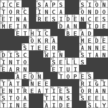 ACROSS 1. Frozen water 4. Plant excrements 8. The Jewish people; Israel 12. Torque (variant) 14. South American Indian 15. Southwest Nigerian state 16. Inactive volcano in Sicily 17. Homes 20. Count _ (2 wds.) 21. Daniel's nick name 22. Binary compound 23. Value system 27. Necklace unit 29. Gumbo ingredient 31. Ancient Persian 34. Bull 35. Singer Murray 36. Compact _ 39. Acquire through effort 41. Comedian Laurel of Laurel & Hardy 42. To the inside or interior of 43. Makes a sale 46. Merit 47. Needle case 48. A really long time 51. Drinks excessively 54. Make lace 56. Born 58. Swiss mountan, "Queen of the Mountains" 61. Pleas 66. Northwest Algerian city 67. Portico 68. Canisters 69. Sew up the eyelids of hawks and falcons 70. Prong on a fork 71. Assistant 72. Cunning DOWN 1. A distinct part 2. ____ d'Azur (French Riviera) 3. Bert's buddy 4. Title for a knight 5. One (Scot) 6. Personal Computers (abbr.) 7. Alleged 8. Male offspring 9. Happening 10. Wrote a lyric poem 11. Olfactory organ 13. Patter 18. Apply (a substance) by light strokes 19. Compass dir. 24. Being at a high temperature 25. Mamie's mate 26. Group working together 28. Collect or gather 30. Originate 32. Heredity factor (abbr.) 33. Car or cant ending 34. Biscuitlike quick bread 36. Expire 37. _ tizzy (2 wds.) 38. Ski resort town in Vermont 40. Remaining after all deductions 44. Nilotic language 45. Mouth edge 49. Single 50. Teachers' org. 52. Greek god of love 53. Founders of families 54. Trial 55. Against 57. Singer James 59. Highlander 60. In an inward manner 62. Actress Charlotte 63. One more than two 64. Conclusion 65. Compass dir.