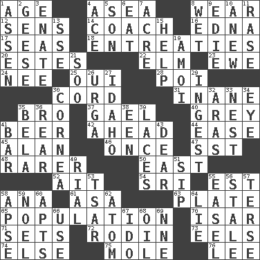 ACROSS 1. Personal question 4. At sea 8. Erode 12. Elected reps. 14. Team commander 16. Pulitzer Prize-winning author Ferber 17. Oceans 18. Pleas 20. _____ Park, CO 22. Shade tree 23. She-sheep 24. Born 25. Fr. "Yes" 28. Luau course 30. Drawstring 31. Empty; void 35. Sis' sibling 37. Highlander 40. Jennifer or Joel 41. Fermented drink made from hops 42. Having the leading position 44. Comfort 45. ____ Jay Lerner 46. At one time in the past 47. Fast jet (abbr.) 48. Less widely known 50. 90 degrees 52. Small island 54. _ Lanka 55. Eastern Standard Time (abbr.) 58. Santa ___, CA 61. White ___ sheet 63. Food holder 65. Census information 70. Austrian river, tributary to the Danube 71. Arranges properly for use 72. "The Thinker" sculptor 73. Snakelike fish 74. Otherwise 75. Undercover agent 76. Area sheltered from the wind DOWN 1. NE Netherlands city 2. Honkers 3. Related on the mother's side 4. Adept person 5. Male child 6. Ingest 7. 43,560 square feet 8. Dripping 9. Singer Brickell 10. Afresh 11. To erase 13. Compass dir. 15. Aid 19. Mine, in Marseilles 21. "Barney Miller" actor Jack 26. Capital and largest city of Mongolia 27. Potato state 29. Consume 30. Pupil covering 32. Ancient river in northeast Turkey 33. Egg locale 34. Sight organ 35. Actor Lugosi 36. Tail end 38. Car or cant ending 39. Shoestrings 41. Tavern 43. Letter starter 49. Monetary unit of Yemen 51. Small drink 53. Russian ruler of old 55. Artist's stand 56. Showing deterioration from age 57. Laconic 58. Domed church section 59. Christmas carol 60. Tenement units (abbr.) 62. Tiny particle 64. Untruth 66. Purpose 67. Wedding promise 68. Petroleum 69. Compass dir.