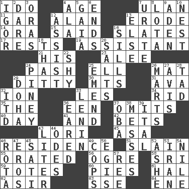 ACROSS 1. Wedding promise 4. Personal question 7. ____ Bator 11. Slender fish 12. ____ Jay Lerner 13. Eat (away) 14. Mouth or opening 15. Alleged 16. Chalkboards 17. Musical pauses 19. Helper 21. Part of HMS, perhaps 23. Toward shelter 24. Romantic infatuation 25. Pipe bend 26. Floor protector 29. Simple song 30. Mountains (abbr.) 31. Actress Gardner 32. Electrically charged atom 33. French article 34. To free from 35. Definite Article 36. Car or cant ending 37. Leaves out 40. 24 hours 41. Also 42. Antes 43. Australian parrot (variant) 45. White ___ sheet 46. Dwelling 51. Killed 55. Spoke pompously 56. Legendary monster 58. Indian title of respect (Mr.) 59. Lugs 60. Sliced desserts 61. Actor Linden 62. SW Saudi Arabia district 63. Compass dir. 64. Compass dir. DOWN 1. Russian composer Stravinsky 2. Have the gumption 3. Mouths or openings 4. Insect wing 5. Greek goddess of the earth (variant) 6. Extremities 7. A salt of uric acid 8. Globular water bottle used in Asia 9. An important port of Yemen 10. A home for chicks 12. Help 13. Otherwise 16. Beverly of Met fame 18. Not this but _ 20. Table seasonings 22. Like a shrinking violet 24. Abounding in pines 25. Make improvements or corrections to 26. Shops 27. Deliberation 28. Bit 29. Capital of the state of Qatar 32. It would 33. Soviet premier 1918-24 36. Having ears or earlike features 37. Chief or king in Benin or Nigeria 38. Makes clutter 39. Slanted text style (abbr.) 43. 61 cubic inches 44. Lyric poems 46. Round or rotation of duties 47. Greek god of love 48. Suttee (variant) 49. 911 reaches them 50. The front part of a cuirass 52. American tennis player Robert 53. SW Asia republic 54. Mediterranean tributary 57. To sift