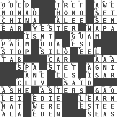 ACROSS 1. Wrote a lyric poem 5. Unclean, religiously 9. Deep reverence 12. Wanderer 14. Like (prefix) 15. Put into a specified state 16. Large country 17. Toward shelter 18. Elected rep. 19. Ewer handle 20. Of or pertaining to yesterday 23. California wine valley 24. Is not 25. Island territory of the United States 27. Inside of hand 30. ___ good deed 32. Eastern Standard Time (abbr.) 33. Obstruct or block passage 34. Grain storage tower 36. Snakelike fish 38. Keyboard key 39. Automobile 40. American Automobile Association (abbr.) 43. Health resort 46. Proofreading order 48. Hindu god of fire 49. A saturated hydrocarbon 51. Raised railways 52. Austrian river, tributary to the Danube 53. 154 in Roman numerals 54. Stated 56. American tennis player Robert 58. Michaelmas daisies 61. E Mali city 64. Luau accessory 65. Singer Brickell 66. Memorize 68. Floor covering 69. Past tense of be (plural) 70. First name in cosmetics 71. Chicken ___ king 72. Genesis locale 73. Oceans DOWN 1. Single time 2. Capital of the state of Qatar 3. Arab leader 4. Daniel's nick name 5. Not this but _ 6. Hero or heavy, e.g. 7. Develop 8. Enemy 9. Indian state 10. Shed a tear 11. Inactive volcano in Sicily 13. 24-hour periods 21. Conclusions 22. Unemotional ones 23. Nathan's nickname 24. Mischievous child 26. Purpose 27. Pacific Standard Time (abbr.) 28. _ moment's notice (2 wds.) 29. Tennis shots 31. Having winglike extensions 35. Threatening words 37. Falls behind 41. Santa ___, CA 42. Wind 44. Light colored 45. Cuckoo 47. Russian ruler of old 48. Help 50. Eluded 53. Riviera of "Kiss of the Spider Woman" 55. Capri or Wright 56. _ mater 57. Lick closed 59. Title for a man of rank and authority 60. Adolescent 61. Yard entry 62. Type of rug 63. Washington bills 65. She-sheep 67. Curvy letter