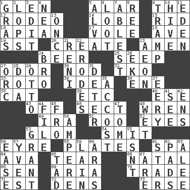 ACROSS 1. Small, secluded valley 5. Having or resembling wings 9. Definite Article 12. Cowboy competition 14. Ear part 15. To free from 16. Bee-related 17. Short-tailed, large-bodied rat 18. "___ Maria" 19. Fast jet (abbr.) 20. Make 23. So be it 24. Fermented drink made from hops 25. Ooze 27. Scent 30. Dreamland 32. Ring climax 33. Printing process, for short 34. It may be bright or harebrained 36. Compass dir. 38. Domesticated feline 39. And so on (abbr.) 40. Compass dir. 43. Below a satisfactory level 46. Religious group 48. Songbird 49. Retirement account (abbr.) 51. Friend of Pooh 52. Snake ____ (dice throw) 53. Take by theft 54. Stricken, poetically 56. Jane of fiction 58. Food holders 61. Health resort 64. Actress Gardner 65. Lacerate 66. Relating to or accompanying birth 68. Elected rep. 69. Operatic vocal solo 70. Swap 71. Eastern Standard Time (abbr.) 72. Habitations of wild animals 73. Celtic language DOWN 1. Pate de foie ____ 2. Chops off 3. Prepare for publication 4. Teachers' org. 5. Inventor's middle name 6. Plunder 7. Most capable 8. Portuguese money of account (variant) 9. _____ steamer (cargo ship) 10. Hub of activity 11. Paradise 13. At one time in the past 21. Painter Guido (1575-1642) 22. Eats (away) 23. Age 24. Sis' sibling 26. Supplement with great effort 27. The grampus (Milton) 28. ___ good deed 29. Von Bismarck 31. Prevent from occurring 35. Buttonhole 37. Suggestive of the supernatural 41. Observe 42. Followers of ems 44. Do some clerical work 45. Away 47. Heavy book 48. Soggy 50. Electrical Unit 53. Let have 55. Is not 56. Comfort 57. Jacques Cousteau's middle name 59. (Had) reclined 60. Ancient river in northeast Turkey 61. Play the lead 62. Groovy apts. 63. Toward shelter 65. Bit 67. "We ___ not amused" (Victoria)