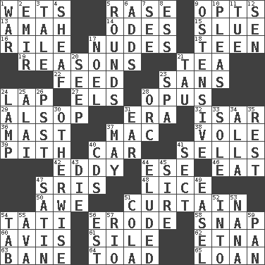 ACROSS 1. Moistens 5. Raze (variant) 9. Chooses 13. Wet nurse 14. Lyric poems 15. Turn sharply 16. Cause heat under the collar 17. Unadorned figures 18. Adolescent 19. Thinks logically 21. Afternoon social gathering 22. Nourish 23. Without 24. Infant locale 27. Raised railways 28. Musical composition 29. Columnist Joseph or Stewart 31. Epoch 32. Austrian river, tributary to the Danube 36. Vertical spar for supporting sails 37. Apple computer (short form) 38. Grand slam 39. Heart or essence 40. 4-wheeled motor vehicle 41. Makes a sale 42. Whirlpool 44. Compass dir. 46. Consume 47. Indian titles of respect 48. Louse (plural) 50. Deep reverence 51. Window treatment 54. Jacques of French films 56. Wear away 58. Fastener 60. Opinion 61. Drop; flow; fall 62. Inactive volcano in Sicily 63. Object of repulsion 64. Frog relative 65. Grant temporary use of DOWN 1. Armed conflict 2. Arab leader 3. Lie 4. Bundle of cut stalks of grain 5. Periods in a boxing match 6. Does sums 7. Perceive with the eye 8. Curvy letter 9. Clearly or manifestly demonstrative 10. Entreaties 11. Third day of the wk. 12. Elected rep. 17. Christmas carol 20. Ooze 21. The 19th letter of the Greek alphabet 23. Health resort 24. Desk light 25. Jai _ 26. Inconspicuous attention getter 28. The grampus (Milton) 30. Else 31. Ewer handle 33. Flatfish 34. Silent film actress Nazimova 35. Take ten 37. Can I? 40. Music discs 41. Religious group 43. Pass on 44. Dodged 45. Father 47. Smooth fabric 49. Artist's stand 51. Root beer relative 52. To the inside or interior of 53. Nanny 54. Bar bill 55. Actress Gardner 56. Eastern Standard Time (abbr.) 57. _ de Janeiro 59. Baking dish