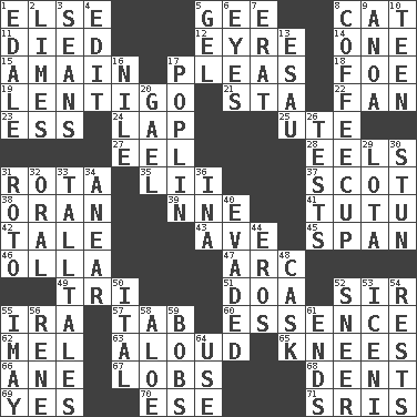 ACROSS 1. Otherwise 5. Unit of force equal to gravity 8. Domesticated feline 11. Passed on 12. Jane of fiction 14. Single 15. At full speed 17. Entreaties 18. Enemy 19. Small, flat, pigmented spot on the skin 21. R.R. building 22. Air blower 23. Curvy letter 24. Infant locale 25. Shoshoni 27. Snakelike fish 28. Snakelike fish 31. Roll call or roster of names 35. Cards in a Roman deck? 37. Native of Scotland 38. NW Algerian seaport 39. Compass dir. 41. Ballerina skirt 42. Falsehood 43. "___ Maria" 45. Connect, as a bridge 46. Spanish pot 47. Curve 49. Three (prefix) 51. ___ good deed 52. Title for a knight 55. Lyricist Gershwin 57. Bar bill 60. Center 62. Cartoonist voice _ Blanc 63. Verbally 65. Leg joints 66. A saturated hydrocarbon 67. Tennis shots 68. Gouge 69. It is so 70. Compass dir. 71. Indian titles of respect DOWN 1. Peak District village in England 2. Citrus fruits 3. Seines 4. Prepare for publication 5. Set 6. Sight organs 7. Part of Q.E.F. 8. Java holder (2 wds.) 9. Small Philippine buffalo 10. Adolescent 13. He sold his birthright 16. The longest river in the world 17. Cotton for raincoats, e.g. 20. Highlander 26. Trials 29. Globular water bottle used in Asia 30. Surprise greatly 31. Printing process, for short 32. Of the mouth 33. Baron Munchausen's specialties 34. Approach 36. _ tizzy (2 wds.) 40. Dodged 44. Greek god of love 48. Keg 50. Slanted text style (abbr.) 52. Contemptuous expression 53. Ancient Celtic tribe of eastern Britain 54. Musical pauses 55. "If ____ say so..." 56. French philosopher Descartes 58. Medicinal plant 59. Moves up and down 61. Conclusions 64. Purpose