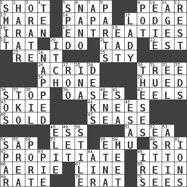 ACROSS 1. Guess 5. Fastener 9. Lightbulb-shaped fruit 13. Female horse 14. Dad 15. Inn 16. SW Asia republic 17. Pleas 19. Make lace 20. Wedding promise 21. Bit 22. Eastern Standard Time (abbr.) 23. Monthly bill 25. Filthy place 26. Sour-tasting 30. Relationship diagram 34. Give a jingle 35. Became colored 36. Obstruct or block passage 39. Fertile tracts in a desert 42. Snakelike fish 43. Migrant worker of the '30s 44. Leg joints 46. Exchanged or delivered for money 47. Gospel singer Marvin 48. Curvy letter 51. Toward the sea 54. Plant excrement 57. Allow 58. Australian flightless bird 60. _ Lanka 62. Appease 65. "Tell ____ the Marines!" 66. Nest on high 67. Actor's bit 68. It's straight from the horse's mouth 69. Pace 70. Part of Q.E.F. 71. Perceives with the eye DOWN 1. Stricken, poetically 2. Ethiopian city, capital of Harari 3. Declaim 4. "___ Little Indians" 5. Broke a traffic law 6. Billionth: prefix 7. Fitting 8. Actors' quests 9. Cooking vessel 10. Singer Brickell 11. Matures 12. Relief 15. Kenny Rogers chart-topper in '80 18. Consume 20. Hankering 24. Slept 27. Friend of Pooh 28. _ tizzy (2 wds.) 29. Writing tables 30. College papers 31. Regret 32. Snakelike fish 33. Begley and Asner 36. Mayday 37. Ring climax 38. Lubricate 40. Compass dir. 41. Ocean 45. He sold his birthright 48. Writer Wiesel 49. Put into a specified state 50. Vertical member of a panel or frame 52. First name in cosmetics 53. Nick name for Arthur 54. Practice fight 55. Type of rug 56. Sweet dark-red dessert wine 58. Inactive volcano in Sicily 59. Confront 61. Charged atoms 63. Sliced dessert 64. Wind 65. Big collection agency