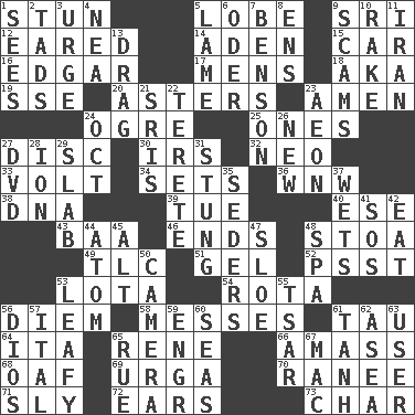 ACROSS 1. Astound 5. Ear part 9. _ Lanka 12. Having ears or earlike features 14. Arabian gulf 15. 4-wheeled motor vehicle 16. _ Allan Poe 17. Not women's 18. Alias (abbr.) 19. Compass dir. 20. Michaelmas daisies 23. So be it 24. Legendary monster 25. Washington bills 27. Plate 30. Big collection agency 32. Modern: prefix 33. Electrical Unit 34. Puts into a specified state 36. Compass dir. 38. Heredity factor (abbr.) 39. Third day of the wk. 40. Compass dir. 43. Sound made by sheep 46. Conclusions 48. Portico 49. Affectionate concern, for short 51. Set 52. Inconspicuous attention getter 53. Globular water bottle used in Asia 54. Roll call or roster of names 56. South Vietnam president (1954) 58. Makes clutter 61. The 19th letter of the Greek alphabet 64. Call ___ day 65. French philosopher Descartes 66. Collect or gather 68. Clumsy lout 69. Capital and largest city of Mongolia 70. The wife of a rajah (variant) 71. Stealthy 72. Hearing organs 73. Burn to charcoal DOWN 1. Perceives with the eye 2. Bits 3. Goad 4. Teachers' org. 5. Unable to walk 6. Baltic tributary 7. Gillaume's butler role 8. Followers of ems 9. Fraudulent business schemes 10. Libertine 11. SW Asia republic 13. To trail on the ground 21. Indian titles of respect 22. Cylindrical with tapered ends 23. Age 24. Sep. follower 26. ___ Haven, CT 27. Movie disc 28. Electrically charged atom 29. Thick slice 31. Feeling sharp psychological pain 35. Spring feasts 37. Moistens 41. Mayday 42. Erode 44. Tiny particle 45. The first octave above the treble staff 47. A type of plum 48. Health resort 50. Device for capturing images 53. Like summer trees 55. Russian ruler of old 56. "Vaya con ____" 57. Slanted text style (abbr.) 59. Engineer (abbr.) 60. Oceans 61. Hyperbolic tangent 62. Toward the sea 63. One who makes use of a thing 65. Regret 67. Big _