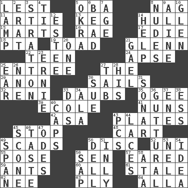 ACROSS 1. For fear that 5. Chief or king in Benin or Nigeria 8. Tired old horse 11. Nick name for Arthur 13. Cask 14. Frame or body of a ship 15. Shops 16. Actress Charlotte 17. Singer Brickell 18. Parent Teacher Association (abbr.) 19. Frog relative 21. American astronaut and politician John 22. Adolescent 24. Domed church section 25. Main course 27. Definite Article 29. Soon (poet.) 30. Travel by water 32. Painter Guido (1575-1642) 33. Applies to a surface 35. Double curve, resembling the letter S 39. Learning spot: Fr. 41. Religious women 42. White ___ sheet 43. Food holders 45. Halt 48. Draw slowly or heavily 49. Large numbers or amounts 50. Flat circle 52. Single; one (prefix) 55. Airs 56. Elected rep. 57. Having ears or earlike features 59. Pismires 60. Everything 61. Showing deterioration from age 62. Born 63. Apply oneself diligently 64. Silent film actress Nazimova DOWN 1. Desk light 2. Part of Q.E.F. 3. Ski resort town in Vermont 4. Teat (slang) 5. Gumbo ingredient 6. Necklace unit 7. Ripen 8. Unadorned figures 9. Place in a line 10. Small, secluded valley 12. First name in cosmetics 14. Assist 20. Single 21. Highlander 23. Bert's buddy 25. Ewer handle 26. Compass dir. 27. Keyboard key 28. Part of HMS, perhaps 30. Institute legal proceedings 31. Underwater navigation system 33. Two (Sp.) 34. According to 36. From the throat 37. Compass dir. 38. Curvy letter 40. Balmoral and tarboosh 43. Personal Computers (abbr.) 44. Shoestrings 45. Biscuitlike quick bread 46. Clothes sense 47. Lyric poems 49. Connect, as a bridge 50. Small valley 51. In an inward manner 53. 1994 drama film starring Jodie Foster 54. It may be bright or harebrained 56. Plant excrement 58. "One Day ___ Time"