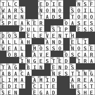 ACROSS 1. Affectionate concern, for short 4. Singer Brickell 8. Science/research agcy. 11. Armed conflicts 13. Words to Nanette 14. Land 15. So be it 16. Bits 17. "Corrida" creature 18. Orator 21. Fertile tracts in a desert 22. Whine 23. Small drink 25. Double-curved letter 26. Two (Sp.) 29. Veterans Day date 32. Assad's deity 34. Plus 35. Connecticut Ivy Leaguer 38. Welt 39. With motion or animation 41. Characteristic smell of wine 43. Chief or king in Benin or Nigeria 44. "___ Maria" 45. Witty Wilde 46. Consumed 50. Lyricist Gershwin 51. Label 54. Storage container 55. Conclusions 57. Phillipine bananalike plant 59. Snuggling 63. Pale green bean 64. Among 67. Length times width 68. Prepare for publication 69. Quote 70. A home for chicks 71. Elected rep. 72. Mild oath 73. A female animal or person DOWN 1. It was, poetically 2. Desk light 3. Algonquian 4. Main course 5. ___ good deed 6. Working for oneself (abbr.) 7. Greek goddess of the dawn 8. Trap for birds or small mammals 9. Male parents of animals 10. Soft thread for cleaning between teeth 12. Fastener 14. R.R. building 19. Malaysian steamed pastry 20. Pipe bend 21. Elect 23. Elected reps. 24. Southeast Asian peninsula 26. Obsolete 27. Margarine 28. Broad, flat, thick piece 30. Flower holders 31. Coop moms 33. Mountain range southwest of Kyrgyzstan 36. Venues 37. Austrian river, tributary to the Danube 39. Wise men 40. Baking chamber 42. Period 45. Probability 47. Basketball assoc. 48. Watched over 49. Compass dir. 51. Stories 52. Tolerate 53. Homeless child 56. Comedian Laurel of Laurel & Hardy 58. Feline 60. Angers 61. Tender 62. Yard entry 64. Adept person 65. Russian fighter aircraft 66. Call ___ day