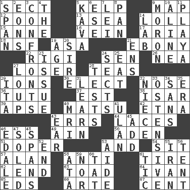 ACROSS 1. Religious group 5. Seaweed 9. Atlas unit 12. "Silly old bear" 13. At sea 14. Hang loosely or laxly 15. Queen of England 1702-14 16. Distinctive style or manner 17. Roberta Peters solo 18. Overdraft (abbr.) 19. White ___ sheet 21. Black 22. Swiss mountan, "Queen of the Mountains" 24. Elected rep. 26. Teachers' org. 27. Failure 28. Afternoon social gatherings 29. Charged particles 30. Opt 32. Olfactory organ 36. Ballerina skirt 37. Eastern Standard Time (abbr.) 38. Austrian river, tributary to the Danube 39. Domed church section 40. Taiwanese island in East China Sea 42. Inactive volcano in Sicily 43. Blunders 44. Shoestrings 46. Curvy letter 49. The 18th letter of the Arabic alphabet 50. An important port of Yemen 51. Drug addict 53. Also 54. Be seated 57. ____ Jay Lerner 58. Opposed to 61. Become fatigued 62. Grant temporary use of 63. Frog relative 64. "Terrible" tsar 65. Begley and Asner 66. Johnson of "Laugh-In" 67. Penny DOWN 1. Connect, as a bridge 2. Immeasurably long periods of time 3. Meets 4. Definite Article 5. Polynesian shrub of the pepper family 6. Compass dir. 7. Flowery wreath 8. Baking dish 9. Person of subnormal intelligence 10. Place in a line 11. Beach, in Buenos Aires 14. Experiment locale 19. Grow older 20. Title for a man of rank and authority 21. Followers of ems 23. Come out of 24. Religious groups 25. Erode 27. Central Nebraska county 28. Trials 29. Call ___ day 31. Memorize 32. Sibling's daughter 33. Clearly or manifestly demonstrative 34. Without 35. Period 40. Medical imaging device (abbr.) 41. Uhlan (variant) 43. Ewer handle 45. Find the sum of 46. Peak District village in England 47. Having a sole or soles 48. Connects, as a bridge 52. Conclusion 53. Assistant 55. SW Asia republic 56. Portable shelter 58. _ moment's notice (2 wds.) 59. Or not 60. Make lace 61. Nervous spasm