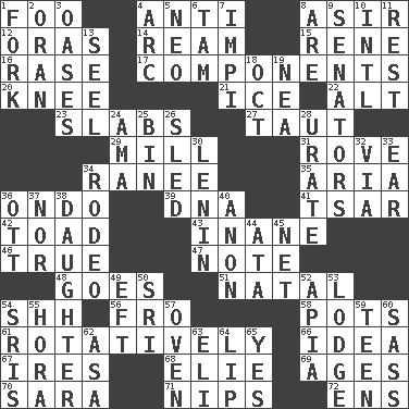 ACROSS 1. Egg _ yung 4. Opposed to 8. SW Saudi Arabia district 12. Mouths or openings 14. 480, 500 or 516 sheets of paper 15. French philosopher Descartes 16. To erase 17. Pieces 20. Leg joint 21. Frozen water 22. The first octave above the treble staff 23. Broad, flat, thick pieces 27. Tense 29. Place where flour is made 31. Be footloose 34. Indian princess (variant) 35. Roberta Peters solo 36. Southwest Nigerian state 39. Heredity factor (abbr.) 41. Russian ruler of old 42. Frog relative 43. Silly 46. Loyal 47. Observe 48. Moves 51. Relating to or accompanying birth 54. Quiet! 56. Back 58. Cooking vessels 61. Rotating or pertaining to rotation 66. The main thing one is thinking about 67. Angers 68. Writer Wiesel 69. Ripens 70. "Two Mules for Sister ____" 71. Pinches, bites 72. Followers of ems DOWN 1. Tined utensil 2. NW Algerian seaport 3. Fertile tracts in a desert 4. Curve 5. Modern: prefix 6. Scottish cap 7. Body of Kaffir warriors 8. "We ___ not amused" (Victoria) 9. Elected representatives 10. International (abbr.) 11. Remainder 13. Stitch closed the eyes of (a falcon) 18. Sep. follower 19. Teachers' org. 24. Nanny (var.) 25. Storage container 26. Downhill vehicle 28. A salt of uric acid 30. Soviet premier 1918-24 32. By way of 33. Hearing organ 34. Cowboy competition 36. Baseball player Mel 37. Not either 38. Female child 40. At once, immediately (arch.) 44. _ moment's notice (2 wds.) 45. Fish or hair follower 49. Newt 50. Indian title of respect (Mr.) 52. Capital of Western Samoa 53. Cabin 54. Indian titles of respect 55. Israeli folk dance 57. Baking chamber 59. Adolescent 60. Backtalk 62. White ___ sheet 63. Connecticut Ivy Leaguer 64. Mouth edge 65. It is so
