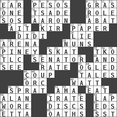ACROSS 1. Hearing organ 4. Mexican monetary units 9. Pate de foie ____ 13. Single 14. Sadhe (variant) 15. Hero or heavy, e.g. 16. Mayday 17. Composer Copland 18. Blind as ____ 19. Small island 21. Apertif with cassis 22. Some stationery 24. "You Light Up My Life" star Conn 26. Untruth 27. Sports stadium 29. Religious women 30. Abounding in pines 31. Three-handed card game 33. Ring climax 36. Affectionate concern, for short 37. Legislator 40. Plus 41. Perceive with the eye 42. Assign a rank or rating to 43. Stared 45. Overturn; upset 47. Lies 48. The grampus (Milton) 49. Electrical Unit 50. Small fatty European fish 52. Wet nurse (var.) 54. Ingest 56. ____ Jay Lerner 57. Feeling or showing extreme anger 59. Pet locale 61. Had on 62. Plates 63. Begley and Asner 64. Singer James 65. Curses 66. Fast jet (abbr.) DOWN 1. Greek goddess of the dawn 2. Small Philippine buffalo 3. Home 4. Parent Teacher Assoc. 5. 1973 Nobel Price Winner (Physics) Leo 6. Indian skirt 7. Scent 8. Elected rep. 9. Raisin fruits 10. Loose flowing garment 11. Having or resembling wings 12. Put into a specified state 20. Prong on a fork 22. Greek god of the underworld 23. The 18th letter of the Arabic alphabet 25. 24-hour periods 27. Flats, for short 28. Cause heat under the collar 29. Nathan's nickname 31. Fastener 32. Krazy ___ of comics 33. Baron Munchausen's specialties 34. Leg joint 35. Probability 38. Spew [out] 39. Roll call or roster of names 44. Yard entry 45. Pupil covering 46. Mouth or opening 49. Observe 50. Narrow, elongated depression 51. Component 52. Roberta Peters solo 53. Vertical spar for supporting sails 55. Small boys 56. Deep reverence 57. Wedding promise 58. Curvy letter 60. Pacific Standard Time (abbr.)