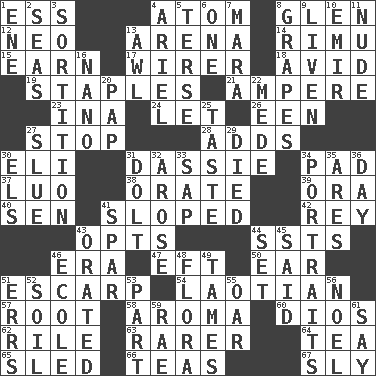 ACROSS 1. Double-curved letter 4. Smallest unit of an element 8. Small, secluded valley 12. Modern: prefix 13. Sports stadium 14. Tall New Zealand timber tree 15. Merit 17. One who wires 18. Enthusiastic 19. Paper fasteners 21. Electrical Unit 23. _ tizzy (2 wds.) 24. Allow 26. Car or cant ending 27. Cease 28. Does sums 30. Biblical high priest 31. Hyrax 34. Writing tablet 37. Nilotic language 38. Speak pompously 39. Mouth or opening 40. Elected rep. 41. Had an oblique or slanted direction 42. Marina Del _, California 43. Chooses 44. Fast planes 46. Period 47. Bank Draft (abbr.) 50. Ewer handle 51. Fortification 54. Of or relating to Laos or its people 57. Carrot, for example 58. Odor 60. "Vaya con ____" 62. Cause heat under the collar 63. More uncommon 64. Afternoon social gathering 65. Downhill vehicle 66. Beverages made from leaves 67. Playfully artful DOWN 1. Compass dir. 2. Oceans 3. Determination 4. Satellite of Uranus 5. Laconic 6. Single 7. Hindu Mythology: god of death 8. Raisin fruits 9. Make or become more lively 10. Arab leader 11. Naked 13. Leather borer 16. Billionth: prefix 20. Infant food 22. Ancient Persian 25. Clothes sense 27. Turn sharply 29. Passed on 30. Raised railways 31. Dunce 32. Came up 33. Plant excrement 34. Likenesses of persons 35. Ancient Greek god of war 36. 24 hours 41. Coast Guard woman 43. Spoke pompously 44. Arrange properly for use 45. Alleged 46. Learning spot: Fr. 48. Plants 49. Makes less strong or intense 51. Blunders 52. Land 53. Piece 55. Rowing implement 56. Christmas carol 59. Actress Charlotte 61. Declare