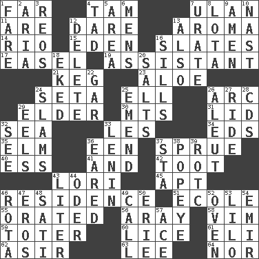 ACROSS 1. At a great distance 4. Scottish cap 7. Uhlan (variant) 11. "We ___ not amused" (Victoria) 12. Have the gumption 13. Odor 14. River (Sp.) 15. Paradise 16. Chalkboards 17. Artist's stand 19. Helper 21. Cask 23. _ vera 24. Bristle 25. Pipe bend 26. Curve 29. A person who is older than you are 30. Mountains (abbr.) 31. Hat (slang) 32. Ocean 33. French article 34. Begley and Asner 35. Shade tree 36. Car or cant ending 37. Upset 40. Double-curved letter 41. Also 42. A blast of a horn 43. Australian parrot (variant) 45. Fitting 46. Home 51. Learning spot: Fr. 55. Spoke pompously 56. Like ___ of sunshine 58. Zeal 59. Carrier 60. Louse (plural) 61. Connecticut Ivy Leaguer 62. SW Saudi Arabia district 63. Area sheltered from the wind 64. Not either DOWN 1. Conductor's collection 2. Roberta Peters solo 3. Vintage cars 4. Bit 5. Type of rug 6. Not women's 7. A salt of uric acid 8. Globular water bottle used in Asia 9. So be it 10. Political cartoonist Thomas 12. Keyboard key 13. In addition 16. Beverly of Met fame 18. Made supply last 20. Table seasonings 22. Slender fish 24. Shuts with force 25. Make improvements or corrections to 26. Eskimo relative 27. Travel on an animal 28. Music discs 29. Snakelike fish 32. Perceive with the eye 33. Soviet premier 1918-24 36. Having ears or earlike features 37. R.R. building 38. Wimpy's pal 39. College mil. group 43. 61 cubic inches 44. River in Europe 46. Round or rotation of duties 47. Greek god of love 48. Suttee (variant) 49. Give a ring to 50. 4th largest of the Great Lakes 52. Baking chamber 53. _ and Stitch 54. Independent ruler or chieftain 57. Adept person