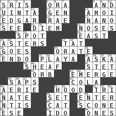 ACROSS 1. Indian titles of respect 5. Mouth or opening 8. Plus 11. National forest in Provo, Utah 13. Commissioned mil. rank 14. Mine, in Marseilles 15. _ Allan Poe 16. Actress Charlotte 17. Billionth: prefix 18. Perceive with the eye 19. South Vietnam president (1954) 21. Olfactory organs 22. Specific locale 24. Compass direction 25. Michaelmas daisies 27. Make lace 29. Leaves 30. Declaim 32. Inside; within (prefix) 33. Beach, in Buenos Aires 35. "____ silly question..." 39. To gather and bind into a bundle 41. Proofreading order 42. Globe 43. Develop 45. Plant excrements 48. Root beer relative 49. Nest on high 50. Parka part 52. Three (prefix) 55. Nathan's nickname 56. Put into a specified state 57. Keyboard key 59. Nuclear Threat Initiatives 60. Domesticated feline 61. Biscuitlike quick bread 62. Compass dir. 63. Wedding promise 64. Washington bills DOWN 1. Takes to court 2. Travel on or in a vehicle 3. Swallowed 4. R.R. building 5. Legendary monster 6. 480, 500 or 516 sheets of paper 7. A saturated hydrocarbon 8. Collect or gather 9. Music written for nine 10. "Vaya con ____" 12. Zeal 14. Small Philippine buffalo 20. ___ a Wonderful Life 21. Remaining after all deductions 23. Mexican monetary units 25. Ripen 26. Male offspring 27. Attempt to accomplish something 28. Auto club (abbr.) 30. Clumsy lout 31. Artist's stand 33. For each 34. Experiment locale 36. Ski resort town in Vermont 37. Cask 38. Had dinner 40. Flexible conduit 43. Environmental prefix 44. Methods 45. Theater features 46. Nick name for Arthur 47. Sliced desserts 49. Queen of England 1702-14 50. Froth on beer 51. Von Bismarck 53. French philosopher Descartes 54. Angers 56. _-fi 58. Non-commissioned officer (abbr.)