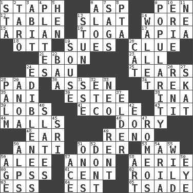 ACROSS 1. Staphylococcus 6. Viper 9. Fenced enclosure 12. Eating place 13. Narrow board 14. Had on 15. Believer in; advocate of (suffix) 16. Ancient Roman robe 17. Capital of Western Samoa 18. Baseball player Mel 19. Takes to court 20. A slight indication 21. Inky black, to poets 23. Everything 24. Son of Isaac 25. Rends 28. Writing tablet 30. NE Netherlands city 34. Long journey 35. Black tropical American cuckoo 36. First name in cosmetics 38. _ tizzy (2 wds.) 39. Tennis shots 41. Learning spot: Fr. 43. Teat (slang) 44. Shopping centers 46. Dinghy 48. Ewer handle 49. Former U.S. Attorney General Janet 50. Against 51. Baltic tributary 53. Informal term for the mouth 56. Toward shelter 57. At once, immediately (arch.) 58. Nest on high 60. Global Positioning Systems (abbr.) 61. Penny 62. Turbulent 63. Curvy letter 64. Eastern Standard Time (abbr.) 65. Sadhe (variant) DOWN 1. R.R. building 2. Edible starchy tuberous root 3. "This won't hurt ____!" 4. Food holders 5. Layer 6. _ vera 7. Droops 8. Parent Teacher Assoc. 9. Teen's desire 10. 4th largest of the Great Lakes 11. Teachers' org. 13. Astound 14. Place for singles 19. Boozer 20. Feline 22. Sound made by sheep 24. The property of being fit to eat 26. Painter Guido (1575-1642) 27. Three-handed card game 28. Inside of hand 29. Small Philippine buffalo 31. Compass dir. 32. And so on (abbr.) 33. Modern: prefix 37. A person who is older than you are 40. Chalkboards 42. Age 45. _ Lanka 47. Lover boys 49. Monthly bill 50. High mountains 51. Washington bills 52. Do not 54. Roberta Peters solo 55. Uncontrolled 56. Mature 57. Adept person 58. Nonscientific branch of learning 59. Sight organ