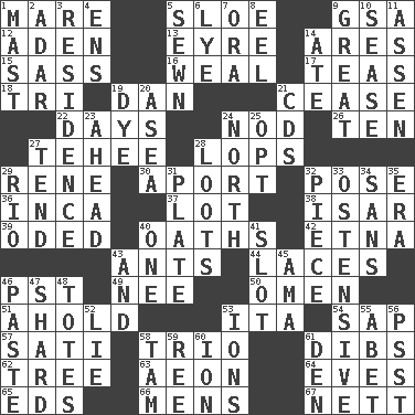 ACROSS 1. Female horse 5. _ gin 9. Girls' org. (abbr.) 12. An important port of Yemen 13. Jane of fiction 14. Ancient Greek god of war 15. Backtalk 16. Welt 17. Beverages made from leaves 18. Three (prefix) 19. Daniel's nick name 21. Desist 22. 24-hour periods 24. Dreamland 26. "___ Little Indians" 27. Giggle 28. Chops off 29. French philosopher Descartes 30. To the left, to Queeg 32. Introduce or present, as a question 36. South American Indian 37. Car dealer's back yard 38. Austrian river, tributary to the Danube 39. Wrote a lyric poem 40. Expletives 42. Inactive volcano in Sicily 43. Pismires 44. Shoestrings 46. Pacific Standard Time (abbr.) 49. Born 50. Sign of things to come 51. Hold, grip (Informal) 53. Call ___ day 54. Plant excrement 57. Suttee (variant) 58. Musical group of three 61. Rights 62. Woody plant 63. Period of immesurable duration 64. Nights before holidays 65. Begley and Asner 66. Not women's 67. Remaining after all deductions DOWN 1. Vertical spar for supporting sails 2. The sixth month of the Jewish calendar 3. Home 4. Followers of ems 5. Stitched 6. Potassium hydroxide 7. Mouth or opening 8. Snakelike fish 9. Relatively large 10. Gospel singer Marvin 11. NE Netherlands city 14. Had dinner 19. Color 20. Toward the sea 21. Music discs 23. At or in the front 24. 0 degrees 25. Choose 27. Watch over 28. Plunders 29. River (Sp.) 31. Food holder 32. Part 33. Clearly or manifestly demonstrative 34. Without 35. Period 40. Single 41. Position in a hierarchy or organization 43. Added to 45. Nursemaid (var.) 46. Thick mixture 47. Broken piece 48. Hauls 52. Whopper 53. Charged atoms 55. Collude with 56. Inconspicuous attention getter 58. Scottish cap 59. To riddle 60. Electrically charged atom 61. Lair