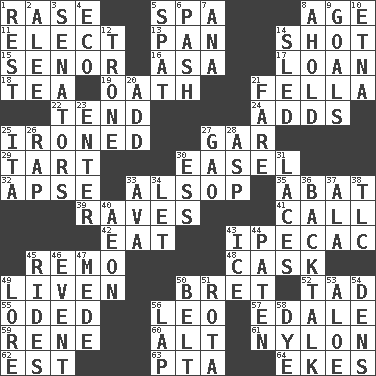 ACROSS 1. Raze (variant) 5. Health resort 8. Mature 11. Opt 13. Baking dish 14. Opportunity 15. Sir (Sp.) 16. White ___ sheet 17. Grant temporary use of 18. Afternoon social gathering 19. Pledge 21. Man or boy (slang) 22. Look after 24. Sums up 25. Pressed 27. Slender fish 29. Small pie 30. Artist's stand 32. Domed church section 33. Columnist Joseph or Stewart 35. Blind as ____ 39. All-night dance parties 41. Give a ring to 42. Consume 43. Medicinal drug used to evoke vomiting 45. San ____ (Riviera town) 48. Keg 49. Make or become more lively 50. Cy Young winner Saberhagen 52. Small boy 55. Wrote a lyric poem 56. Lion 57. Peak District village in England 59. French philosopher Descartes 60. Keyboard modifier key 61. Thermoplastic polyamide 62. Eastern Standard Time (abbr.) 63. Parent Teacher Association (abbr.) 64. Supplements with great effort DOWN 1. Take ten 2. Toward shelter 3. Legislators 4. Environmental prefix 5. Argument over a trivial matter 6. Romantic infatuation 7. Santa ___, CA 8. Hold, grip (Informal) 9. Finish lines 10. Inactive volcano in Sicily 12. Marketplace scale 14. Downhill vehicle 20. Find the sum of 21. Conductor's collection 23. Keyboard key 25. Call ___ day 26. Reproach for some lapse or misdeed 27. E Mali city 28. Cleo's killer 30. Curvy letter 31. Shoestrings 33. Actress Gardner 34. Allow 36. Sass 37. Wing 38. Affectionate concern, for short 40. Age 43. Frozen water 44. Eucharist need 45. Amusement-park features 46. Happening 47. Ancient Persian 49. Old wives' tales, e.g. 50. Waist strap 51. Roll call or roster of names 53. Medicinal plant 54. Lairs 56. Pet locale 58. Color