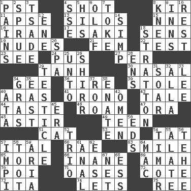 ACROSS 1. Pacific Standard Time (abbr.) 4. Went for two points 8. Apertif with cassis 11. Domed church section 13. Grain storage towers 15. Compass dir. 16. SW Asia republic 17. 1973 Nobel Price Winner (Physics) Leo 18. Elected reps. 19. Unclothed pictures 21. Opposite of masc. 22. Trial 23. Observe 24. Fluid product of inflammation 27. For each 29. Hyperbolic tangent 30. Rhinal 34. Unit of force equal to gravity 36. Become fatigued 39. Fur scarf 40. Ancient river in northeast Turkey 41. U. of Maine site 43. Lie 44. Clothes sense 46. Wander 47. Mouth or opening 48. Moving or stirring 49. Adolescent 51. Domesticated feline 53. Conclusion 54. Make lace 57. Slanted text style (abbr.) 60. Actress Charlotte 63. Grin 65. Greater amount 66. Silly 69. Wet nurse 70. Luau course 71. Fertile tracts in a desert 72. ____ d'Azur (French Riviera) 73. Call ___ day 74. Allows 75. Portuguese money of account (variant) DOWN 1. Aches 2. Upset 3. Sadhe (variant) 4. Compass dir. 5. Part of HMS, perhaps 6. Norwegian king 7. Puff or smoke 8. Leg joint 9. Taverns 10. State of inaction 12. Compass dir. 14. Simple or foolish person 18. Ski resort town in Vermont 20. Health resort 25. To (old English) 26. Bake eggs in their shells 28. Followers of ems 29. One of the two male reproductive glands 31. Fly high 32. Silent film actress Nazimova 33. Area sheltered from the wind 34. Pate de foie ____ 35. Compass direction 37. Friend of Pooh 38. Maternal 40. "One Day ___ Time" 42. Sign of something about to happen 45. Period 50. Begley and Asner 52. Musical group of three 54. The easternmost of the Lesser Sundas 55. Having winglike extensions 56. Giggle 57. Body of Kaffir warriors 58. A blast of a horn 59. Operatic vocal solo 61. Of or related to the anus 62. Relaxation 64. Big _ 67. Fish or hair follower 68. Curvy letter