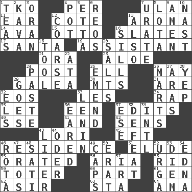 ACROSS 1. Ring climax 4. For each 7. ____ Bator 11. Ewer handle 12. ____ d'Azur (French Riviera) 13. Scent 14. Actress Gardner 15. "Beetle Bailey" pooch 16. Chalkboards 17. Before Barbara or Clara 19. Aide 21. Mouth or opening 23. _ vera 24. Mail 25. Pipe bend 26. Fifth month 29. An organ shaped like a helmet 30. Mountains (abbr.) 31. "We ___ not amused" (Victoria) 32. Greek goddess of the dawn 33. French article 34. Hit sharply and swiftly 35. Allow 36. Car or cant ending 37. Proofreads 40. Compass dir. 41. Also 42. Elected reps. 43. Australian parrot (variant) 45. Lizard (obsolete) 46. Home 51. Evade 55. Declaimed 56. Operatic vocal solo 58. To free from 59. Carrier 60. Piece 61. Commissioned military rank (abbr.) 62. SW Saudi Arabia district 63. R.R. building 64. Wet nurse (var.) DOWN 1. Beverages made from leaves 2. Polynesian shrub of the pepper family 3. NW Algerian seaport 4. Cooking vessel 5. Singer James 6. Vintage cars 7. A salt of uric acid 8. Globular water bottle used in Asia 9. So be it 10. Political cartoonist Thomas 12. Rough 13. In addition 16. Beverly of Met fame 18. Instrument 20. Table seasonings 22. "One Day ___ Time" 24. Thick mixture 25. Make improvements or corrections to 26. Shops 27. Ancient river in northeast Turkey 28. Slangy assent 29. Leaves 32. Raised railways 33. Soviet premier 1918-24 36. Having ears or earlike features 37. Compass dir. 38. Outscore 39. International (abbr.) 43. 61 cubic inches 44. Baltic tributary 46. Roll call or roster of names 47. Greek god of love 48. Suttee (variant) 49. Balmoral and tarboosh 50. Part of Q.E.F. 52. Capital and largest city of Mongolia 53. South Vietnam president (1954) 54. Pulitzer Prize-winning author Ferber 57. Retirement account (abbr.)
