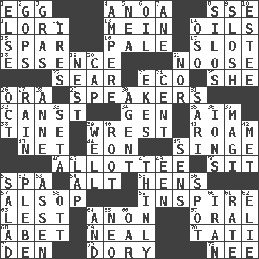 ACROSS 1. Ovum 4. Small Philippine buffalo 8. Compass dir. 11. Australian parrot (variant) 13. Count _ (2 wds.) 14. Petroleums 15. Practice fight 16. Light colored 17. Notch 18. Gist 21. Trap for birds or small mammals 22. Wither 23. Environmental prefix 25. A female animal or person 26. Mouth or opening 29. Orators 32. 2nd pers. sing. pres. of can (arch.) 34. Commissioned mil. rank 35. Direct toward a target or goal 38. Prong on a fork 39. Obtain by seizing forcibly or violently 41. Wander 43. Fish or hair follower 44. A really long time 45. Scorch 46. One to whom something is allotted 50. Be seated 51. Health resort 54. The first octave above the treble staff 55. Coop moms 57. Columnist Joseph or Stewart 59. Motivate 63. For fear that 64. Soon (poet.) 67. Relating to the mouth 68. Collude with 69. Be tempered by heat 70. Jacques of French films 71. Lair 72. Dinghy 73. Born DOWN 1. Otherwise 2. Republicans 3. Pate de foie ____ 4. Electrical Unit 5. Teachers' org. 6. Petroleum 7. A saturated hydrocarbon 8. Grain storage towers 9. Agitate, as a liquid 10. First name in cosmetics 12. Angers 14. Bear (Spanish) 19. A home for chicks 20. Head covering 21. And not 23. Makes supply last 24. Penny 26. Sep. follower 27. Water falling in drops from the sky 28. Singer Murray 30. Rep 31. Indian skirt 33. Bristle 36. Charged particles 37. Wise men 39. Water source 40. Carrot, for example 42. Was introduced to 45. Elected reps. 47. Pet locale 48. Without viscosity 49. Car or cant ending 51. First course 52. Military trainee 53. NE Netherlands city 56. Blemish 58. Baseball player Mel 60. SW Asia republic 61. Assign a rank or rating to 62. Writer Wiesel 64. Also 65. Modern: prefix 66. Rowing implement