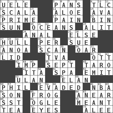 ACROSS 1. Ubangi River tributary 5. Baking dishes 9. Affectionate concern, for short 12. Any of the three canals of the cochlea 14. Medicinal plant 15. Actress Gardner 16. A-one 17. Ache 18. Storage container 19. Player for Phoenix 20. Seas 23. Came down and settled, as after flight 24. Of or related to the anus 25. Otherwise 27. Frame or body of a ship 30. For each 32. Take to court 33. Small Philippine buffalo 34. Skim 36. Boat paddle 38. Flaplike covering 39. Federal power corp. 40. Baseball player Mel 43. Mischievous child 46. Back-to-school mo. 48. Pacific island yam 49. Call ___ day 51. Health resort 52. Give off 53. Uhlan (variant) 54. Style 56. Silvers or Donahue 58. Eluded 61. Basketball assoc. 64. Male child 65. Tree-dwelling hopper 66. Approach 68. Fast jet (abbr.) 69. Stare at amorously 70. Intended 71. Beverage made from leaves 72. Sight organs 73. Toward shelter DOWN 1. United States Postal Service (abbr.) 2. Shade of tan 3. (Had) reclined 4. Shade tree 5. Dad 6. Actor Alda or Thicke 7. Annoying sounds 8. Elected rep. 9. Eating place 10. 57 in ancient Rome 11. Patter 13. Period of immesurable duration 21. Balmoral and tarboosh 22. Opts 23. At sea 24. According to 26. Nilotic language 27. Actor Linden 28. Corn or form start 29. Farming town in central California 31. All-night dance parties 35. Slept 37. Wander 41. Three (prefix) 42. Small child 44. Place where flour is made 45. Parent Teacher Association (abbr.) 47. Lie 48. "___ Little Indians" 50. Disorder of the immune system 53. National forest in Provo, Utah 55. First of billions? 56. Inconspicuous attention getter 57. Flexible conduit 59. Grand slam 60. Matures 61. Actress Patricia 62. Object of repulsion 63. Johnson of "Laugh-In" 65. Enemy 67. Teachers' org.