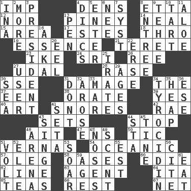 ACROSS 1. Mischievous child 4. Lairs 8. Singer James 12. And not 13. Abounding in pines 14. Actress Patricia 15. Length times width 17. _____ Park, CO 18. Through, poetically 19. Core 21. Cylindrical with tapered ends 23. Mamie's husband 24. Indian title of respect (Mr.) 26. Portuguese money of account (variant) 27. Hereditary estate 28. Raze (variant) 30. Compass dir. 31. Break 34. Definite Article 37. Car or cant ending 38. Declaim 39. Affirmative reply 40. Tate display 41. Sounds asleep 42. Actress Charlotte 43. Arranges properly for use 44. Cease 46. Small island 47. Followers of ems 50. Nervous spasm 51. Actresses Bloom and Felton 54. Pertaining to the sea 57. Cassini of fashion 58. Fertile tracts in a desert 60. Singer Brickell 62. Actor's bit 63. Representative 64. Call ___ day 65. Afternoon social gatherings 66. Repose 67. Fish or hair follower DOWN 1. _ tizzy (2 wds.) 2. Greater amount 3. Elected leader of a country 4. Plates 5. Keyboard key 6. Born 7. System (abbr.) 8. Main course 9. Giggle 10. Small pie 11. _ vera 13. Fenced enclosure 16. "____ silly question..." 20. Snakelike fish 22. Celtic language 25. Feeling or showing extreme anger 27. One who uses or employs something 29. Eras 30. Ocean 31. Do not 32. Came up 33. Spoil 34. Polypeptide antibiotic 35. Pile 36. Compass dir. 41. Stalk of a moss capsule 43. Burns superficially 44. R.R. building 45. Prong on a fork 46. Sports stadium 48. Olfactory organs 49. Aroma 51. Electrical Unit 52. Writer Wiesel 53. Fly high 55. Eastern Standard Time (abbr.) 56. Quote 59. Grow older 61. Erode