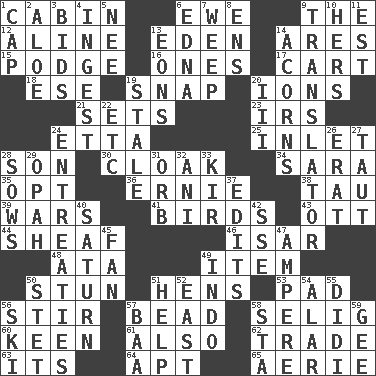 ACROSS 1. Apartment or room in a ship 6. She-sheep 9. Definite Article 12. Place in a line 13. Paradise 14. Ancient Greek god of war 15. Plash 16. Singles 17. Draw slowly or heavily 18. Compass dir. 19. Fastener 20. Charged particles 21. Arranges properly for use 23. Big collection agency 24. Singer James 25. An arm off of a larger body of water 28. Boy, to dad 30. Loose outer garment 34. "Two Mules for Sister ____" 35. Choose 36. Bert's buddy 38. The 19th letter of the Greek alphabet 39. Armed conflicts 41. Avian creatures 43. Baseball player Mel 44. Bundle of cut stalks of grain 46. Austrian river, tributary to the Danube 48. "One Day ___ Time" 49. Detail 50. Surprise greatly 51. Coop moms 53. Groovy apt. 56. Commotion 57. Necklace unit 58. Former Milwaukee Brewers owner Bud 60. Peachy ____! 61. In addition 62. Barter 63. It is 64. Fitting 65. Nest on high DOWN 1. Head covering 2. Medicinal plant 3. Auction offers 4. Consume 5. Born 6. Pulitzer Prize-winning author Ferber 7. Shed a tear 8. Followers of ems 9. Interpreter 10. Possessive pronoun 11. Eastern Standard Time (abbr.) 13. Immeasurably long periods of time 14. Oak nuts 19. Showing deterioration from age 20. One more than two 22. And so on (abbr.) 24. Pleas 26. Part of Q.E.F. 27. Drawn tight 28. Sty mamas 29. Brightly colored fish 31. Globe 32. Black tropical American cuckoo 33. Apertif with cassis 37. Proofreads 40. Titan orbits this 42. Compass dir. 45. Air blower 47. Electrical Unit 49. Southeast Asian peninsula 50. Proofreading order 51. Aid 52. 90 degrees 54. Having or resembling wings 55. "You Light Up My Life" star Conn 56. What Jean-Claude Killy likes to do 57. Sound made by sheep 58. R.R. building 59. Unit of force equal to gravity
