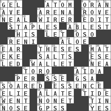 ACROSS 1. Set 4. Smallest unit of an element 8. Northwest Algerian city 12. "___ Maria" 13. Sports stadium 14. Be footloose 15. Be tempered by heat 17. One who wires 18. Prepare for publication 19. Paper fasteners 21. Most capable 23. Part of HMS, perhaps 24. Allow 26. Bear (Spanish) 27. Painter Guido (1575-1642) 28. _ vera 30. Ewer handle 31. College papers 34. Floor protector 37. Make supply last 38. Table seasonings 39. Compass dir. 40. Directed 41. Place for singles 42. Teachers' org. 43. "Corrida" creature 44. Opera by Verdi 46. For each 47. Compass dir. 50. Girls' org. (abbr.) 51. Flew 54. Center 57. Writer Wiesel 58. Having winglike extensions 60. Event that recurs at intervals 62. Left 63. Music written for nine 64. Shallow baking pan 65. Sense of smell 66. Global Positioning Systems (abbr.) 67. Affirmative reply DOWN 1. Separate the seeds from cotton 2. Nights before holidays 3. Resembling or made to resemble leather 4. Satellite of Uranus 5. Laconic 6. Single 7. Hindu Mythology: god of death 8. Threatening words 9. Cowboy competition 10. Advice 11. Remaining after all deductions 13. Leather borer 16. (Had) reclined 20. Air pressure measure (abbr.) 22. Scornful sounds 25. Clothes sense 27. Immoral or dissolute person 29. For fear that 30. Snakelike fish 31. Russian ruler of old 32. Saint headwear 33. Pipe bend 34. Ananias' fault 35. At sea 36. Beverage made from leaves 41. Had on 43. Cigar-shaped 44. Grow older 45. Is not 46. Aches 48. Seines 49. _____ Park, CO 51. Stitched 52. Butter sub 53. Mild oath, euphamism for damn 55. Arrange properly for use 56. Singer Brickell 59. Trim (branches) 61. Followers of ems