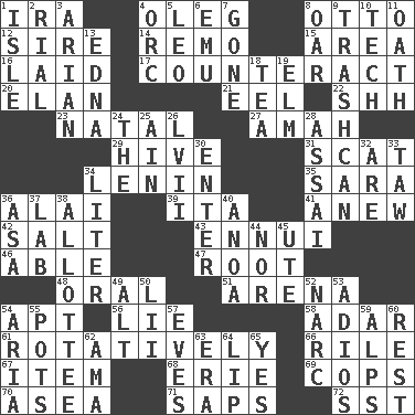 ACROSS 1. Retirement account (abbr.) 4. Cassini of fashion 8. Von Bismarck 12. Title for a man of rank and authority 14. San ____ (Riviera town) 15. Length times width 16. Put down 17. Frustrate 20. Enthusiasm 21. Snakelike fish 22. Quiet! 23. Brizilian seaport 27. Housemaid 29. Hub of activity 31. Jazz singing style 34. Soviet premier 1918-24 35. "Two Mules for Sister ____" 36. Jai _ 39. Call ___ day 41. Afresh 42. Table seasoning 43. World-weariness 46. Competent 47. Carrot, for example 48. Taken by mouth 51. Sports stadium 54. Fitting 56. Falsehood 58. The sixth month of the Jewish calendar 61. Producing rotation 66. Cause heat under the collar 67. A distinct part 68. One of the Great Lakes 69. 911 reaches them 70. At sea 71. Plant excrements 72. Fast jet (abbr.) DOWN 1. Capri or Wright 2. Monetary unit of Yemen 3. Believer in; advocate of (suffix) 4. The grampus (Milton) 5. Lion 6. Australian flightless bird 7. Went 8. Rowing implement 9. File 13 10. Technician 11. Pledge 13. Pulitzer Prize-winning author Ferber 18. Beverage made from leaves 19. Shade tree 24. Definite Article 25. The 18th letter of the Arabic alphabet 26. 57 in ancient Rome 28. Slender Brazilian palm 30. Keyboard key 32. "We ___ not amused" (Victoria) 33. The 23rd letter of the Hebrew alphabet 34. 61 cubic inches 36. White ___ sheet 37. Experiment locale 38. One to whom something is allotted 40. Small Philippine buffalo 44. Or not 45. Shoshoni 49. Keyboard modifier key 50. Cards in a Roman deck? 52. Drug cop 53. Goodbye (Sp.) 54. Roberta Peters solo 55. Cooking vessels 57. Nights before holidays 59. High mountains 60. Relief 62. Housemaid (var.) 63. Period 64. Mouth edge 65. Affirmative reply