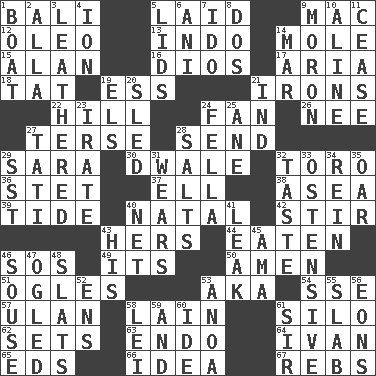 ACROSS 1. Indonesian resort city 5. Put down 9. Apple computer (short form) 12. Butter sub 13. Southeast Asian peninsula 14. Undercover agent 15. ____ Jay Lerner 16. "Vaya con ____" 17. Roberta Peters solo 18. Make lace 19. Curvy letter 21. Metal shackles 22. Land elevation 24. Air blower 26. Born 27. Laconic 28. Transmit 29. "Two Mules for Sister ____" 30. A sleeping potion; an opiate (poet.) 32. "Corrida" creature 36. Proofreading order 37. Pipe bend 38. At sea 39. Periodic rise and fall of the sea level 40. Relating to or accompanying birth 42. Tumult 43. Possessive pronoun 44. Ingested 46. Mayday 49. It is 50. So be it 51. Stares at amorously 53. Alias (abbr.) 54. Compass dir. 57. ____ Bator 58. (Had) reclined 61. Grain storage tower 62. Arranges properly for use 63. Inside; within (prefix) 64. "Terrible" tsar 65. Begley and Asner 66. It may be bright or harebrained 67. Confederate soldiers (slang) DOWN 1. Water vessel 2. Silent film actress Nazimova 3. Tough but pliablecoriaceous 4. Electrically charged atom 5. Hats (slang) 6. Black tropical American cuckoo 7. Wedding promise 8. Two (Sp.) 9. Person of subnormal intelligence 10. Place in a line 11. Stop 14. Spoil 19. Raised railways 20. Downhill vehicle 21. Working for oneself (abbr.) 23. Feeling or showing extreme anger 24. Chap (slang) 25. One (Scot) 27. Jacques of French films 28. Table seasonings 29. Fast jet (abbr.) 31. Erodes 32. Clothes sense 33. Clearly or manifestly demonstrative 34. It's straight from the horse's mouth 35. Boat paddle 40. Fish or hair follower 41. Path through which fluid escapes 43. Part of HMS, perhaps 45. Nanny (var.) 46. Boozer 47. Stared at amorously 48. Narrow boards 52. Followers of ems 53. Small Philippine buffalo 55. Broad, flat, thick piece 56. Immeasurably long periods of time 58. Flowery wreath 59. Added to 60. Binary compound 61. Title for a knight